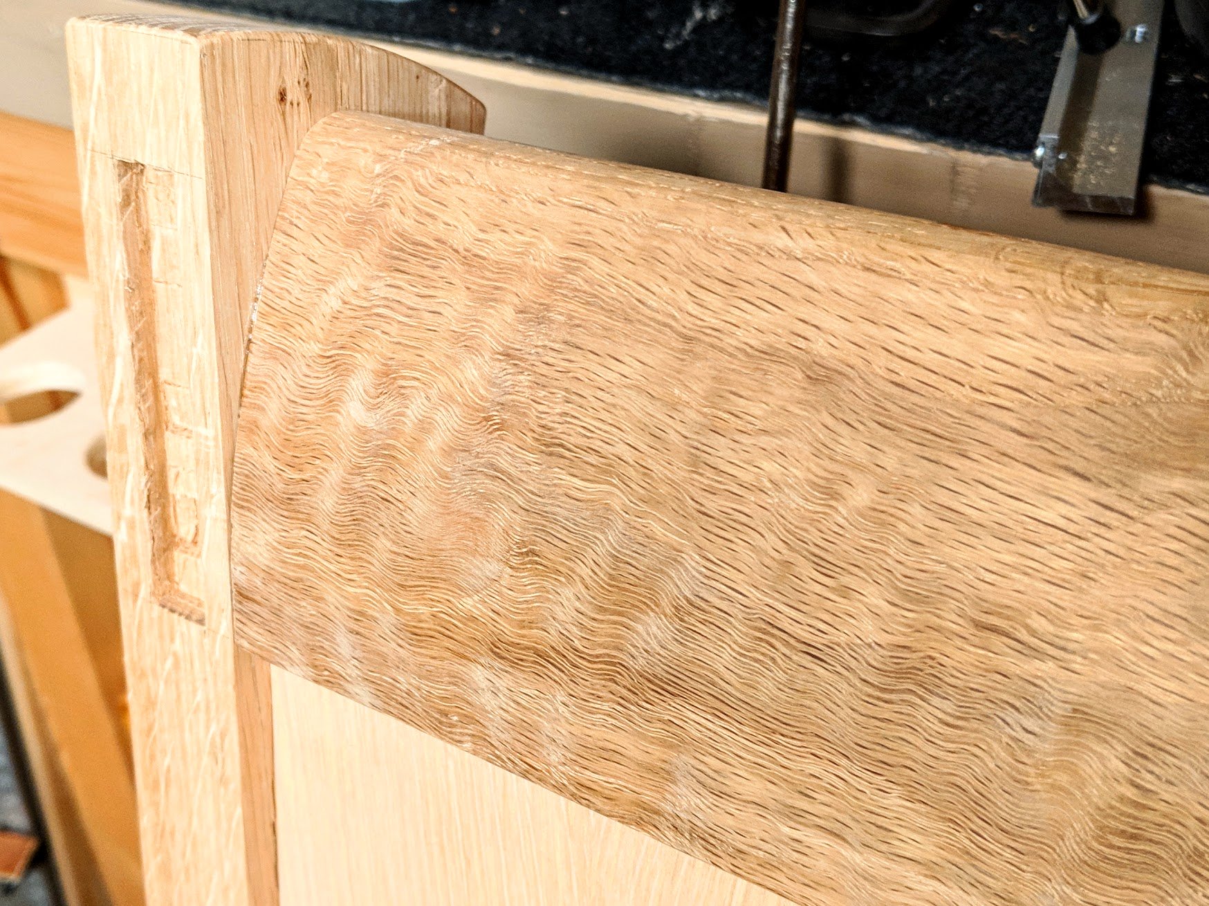 This week I made an oak baby's cot, or at least I began making my granddaughter's cot for when she arrives. It's oak, only because I had saved some specially figured oak for something special and what could be more special than a new baby? I got the more complicated work completed so I felt pretty satisfied because presenting the awkward aspects to the videographers is not always as easy as it might look. Oh, so you'll guess now that I am filming it for an upcoming woodworking masterclasses series too. I suspect it's more a granddad thing from what I've seen. I have truly enjoyed this working and it is easier having completed the prototype—no more guesswork. I completed the prototype last week as I also worked on a secret prototype project I am making from three full sheets of 3/4" birch 13-ply plywood I bought in a few weeks ago when I made the prototype cot in pine. The work is going well in both camps and the secret project prototype is now fully completed.