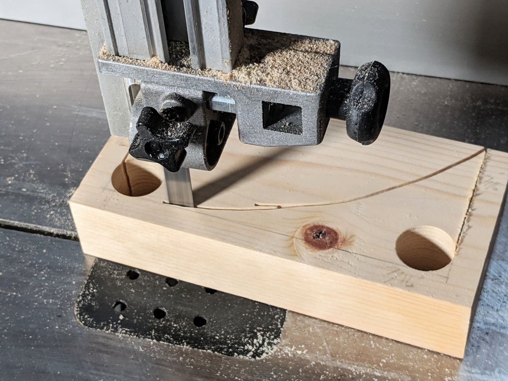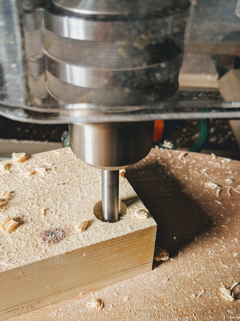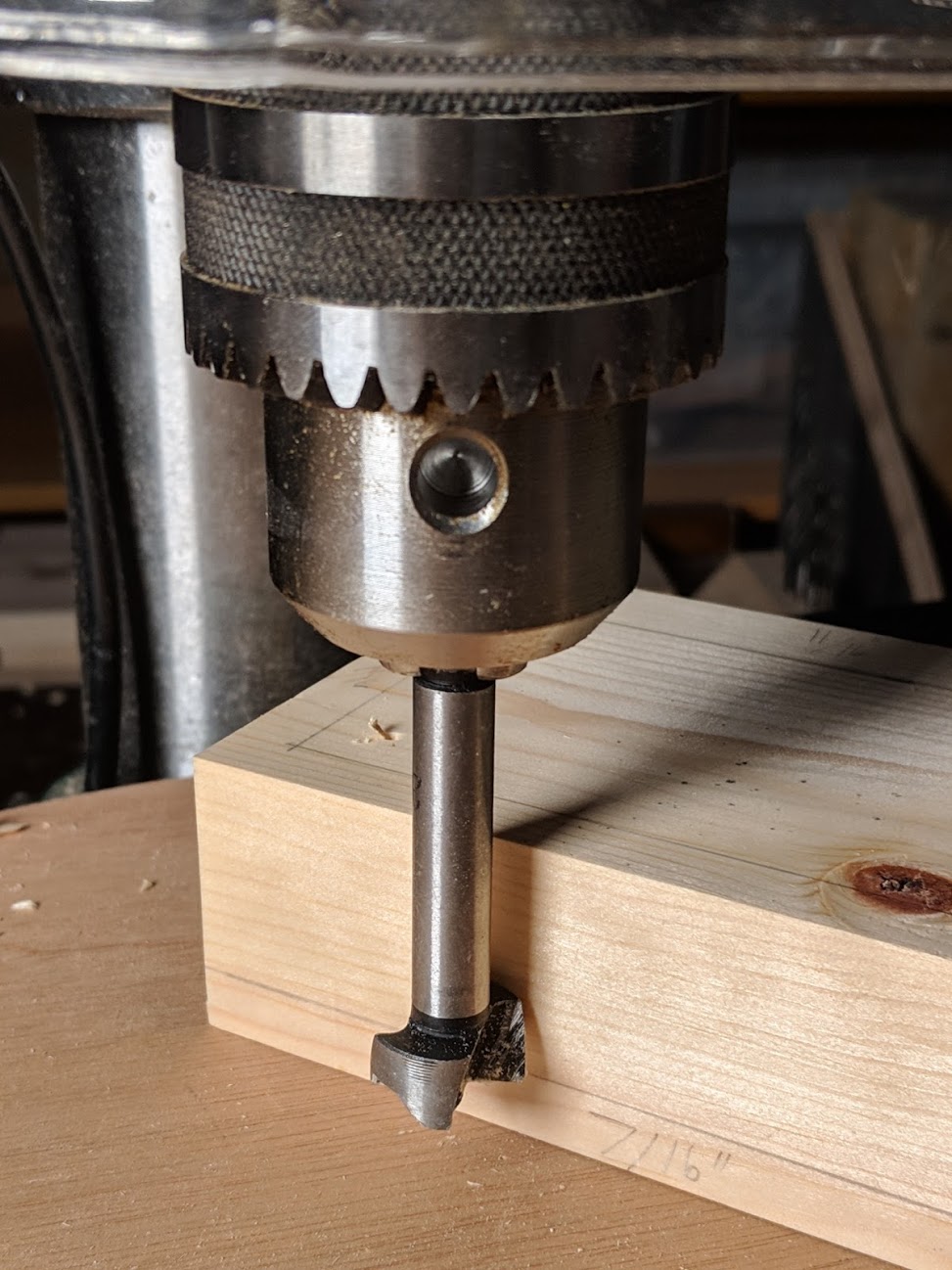 Set a 3/4" Forstner bit in the drill press to 7/16" from the bottom of the 2x4 block. This will leave 7/16" between the bottom of the hole and the surface of the table.