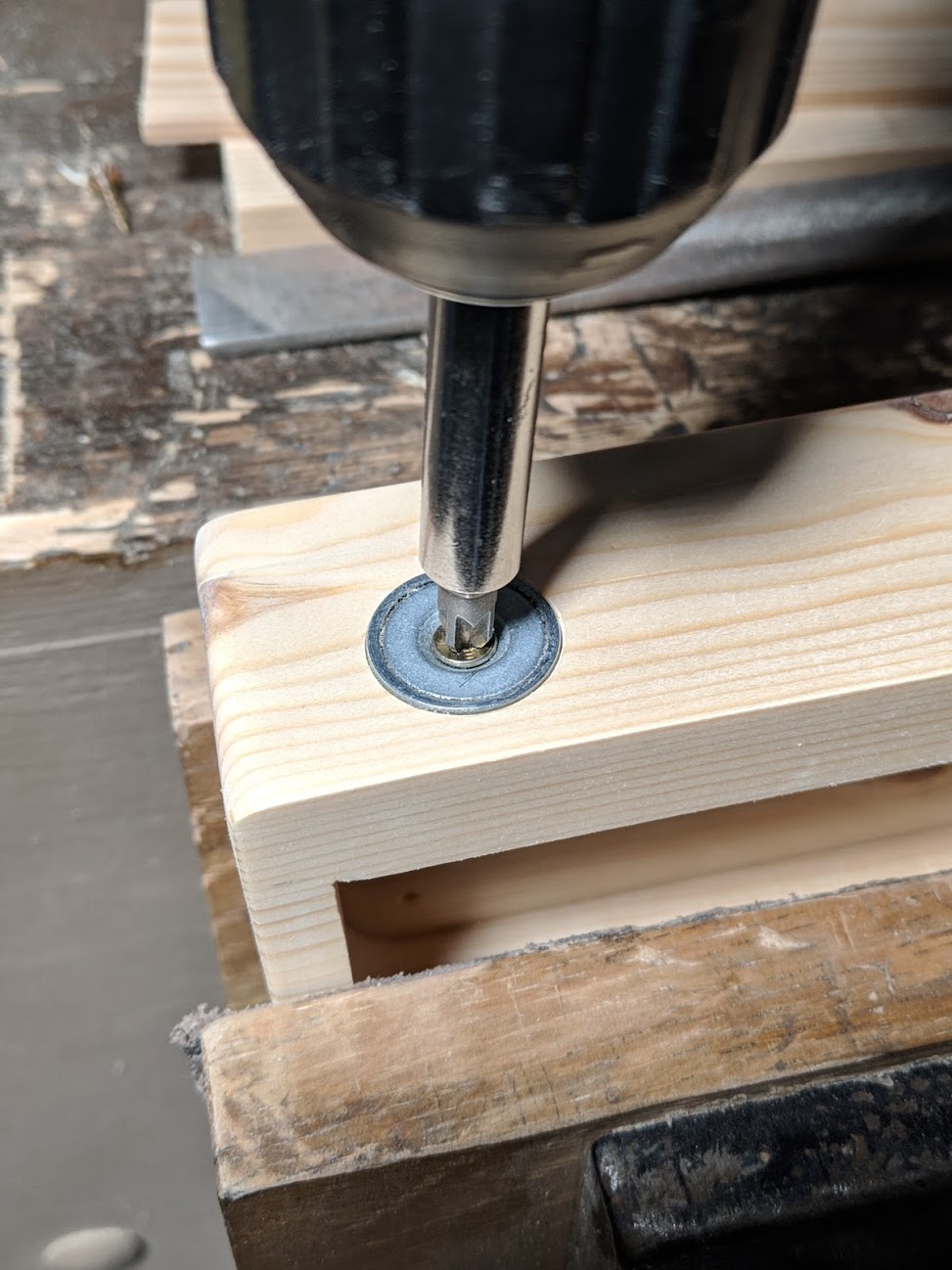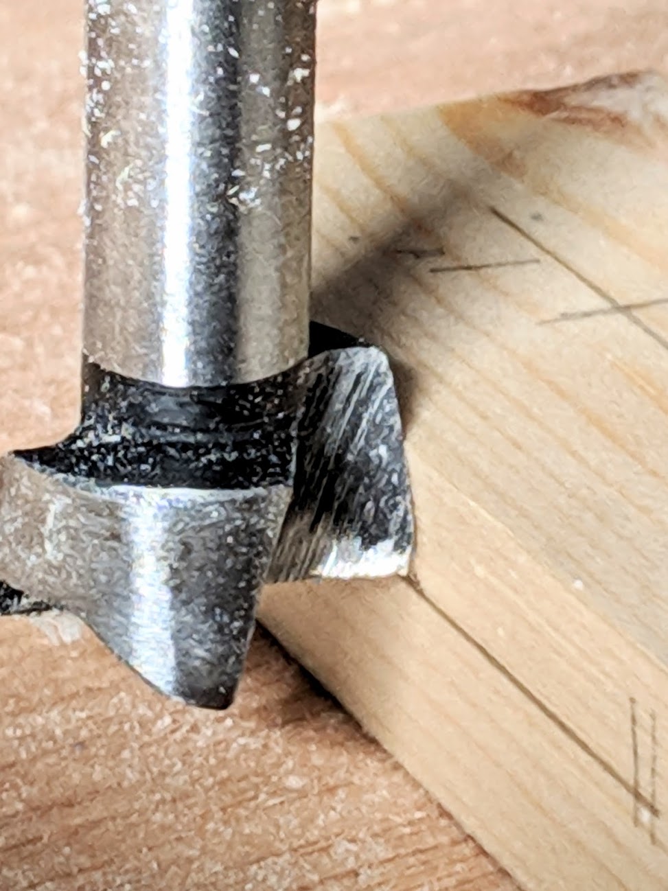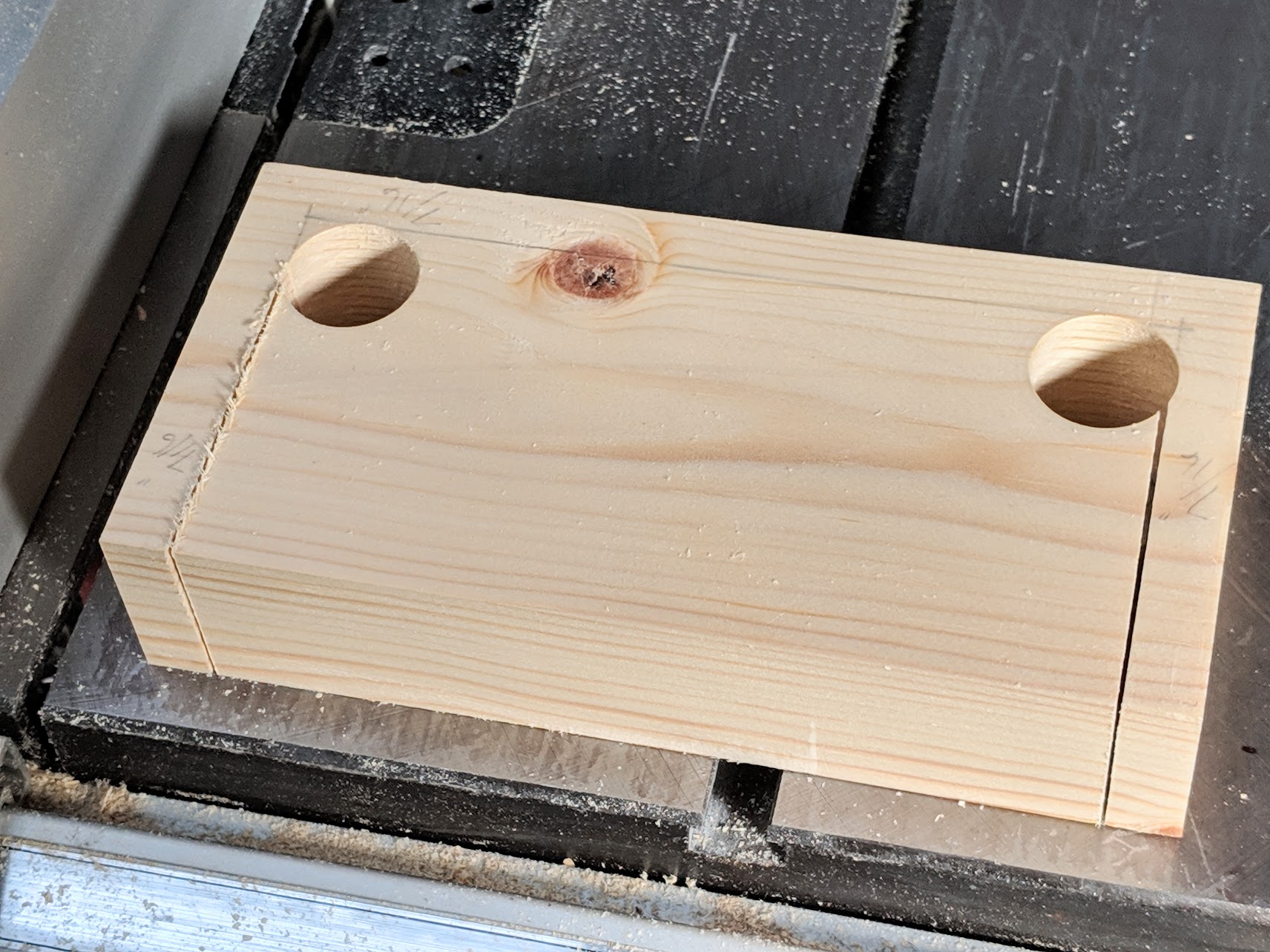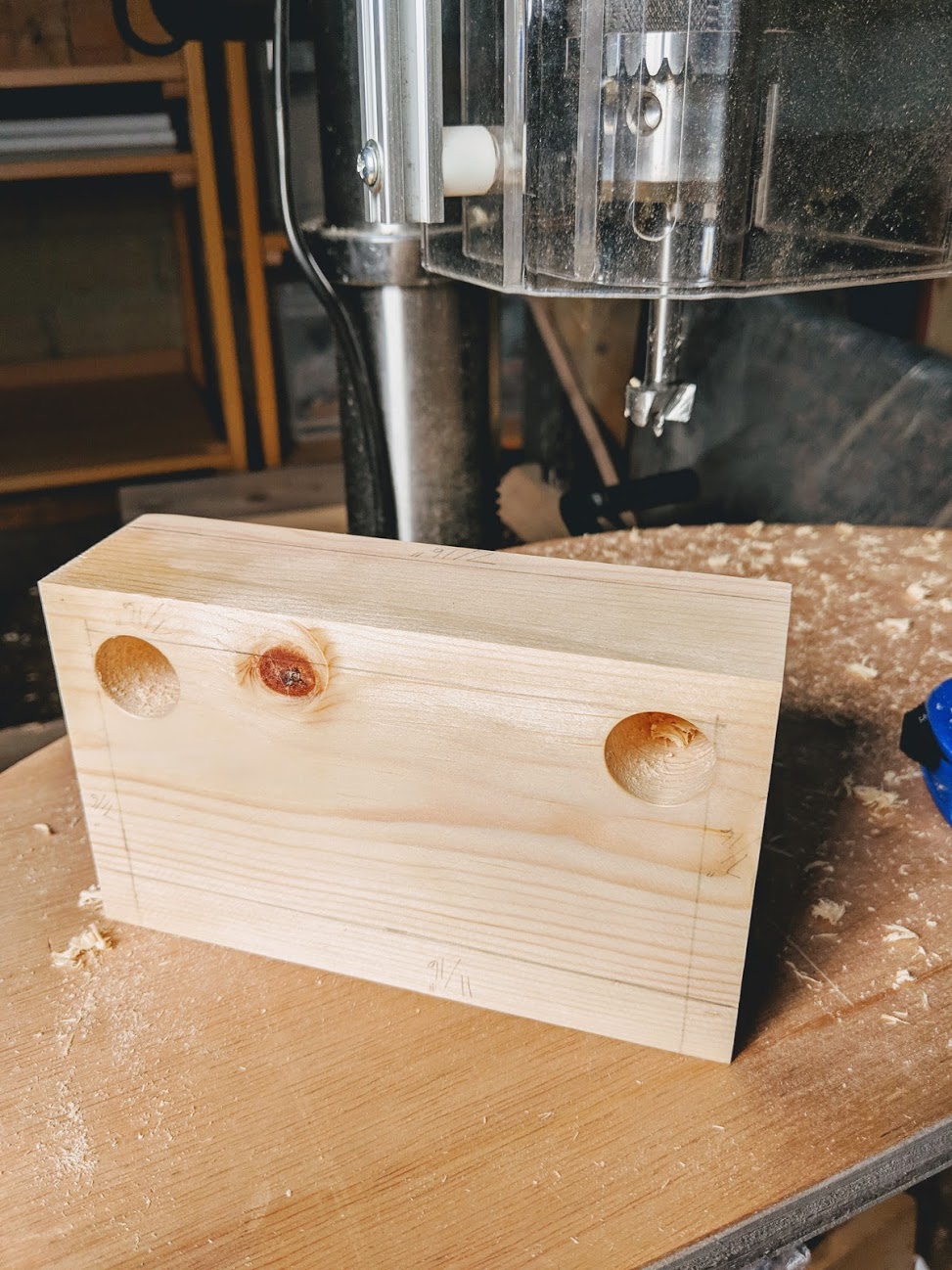 Set a 3/4" Forstner bit in the drill press to 7/16" from the bottom of the 2x4 block. This will leave 7/16" between the bottom of the hole and the surface of the table.