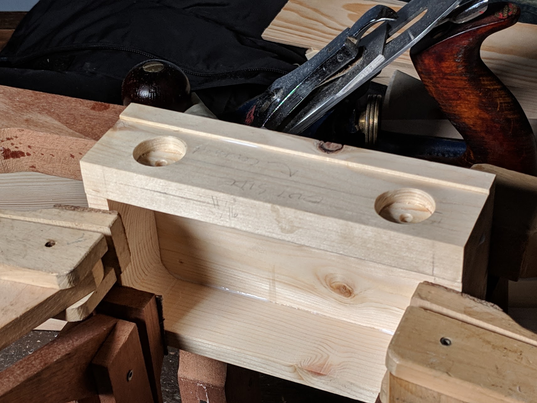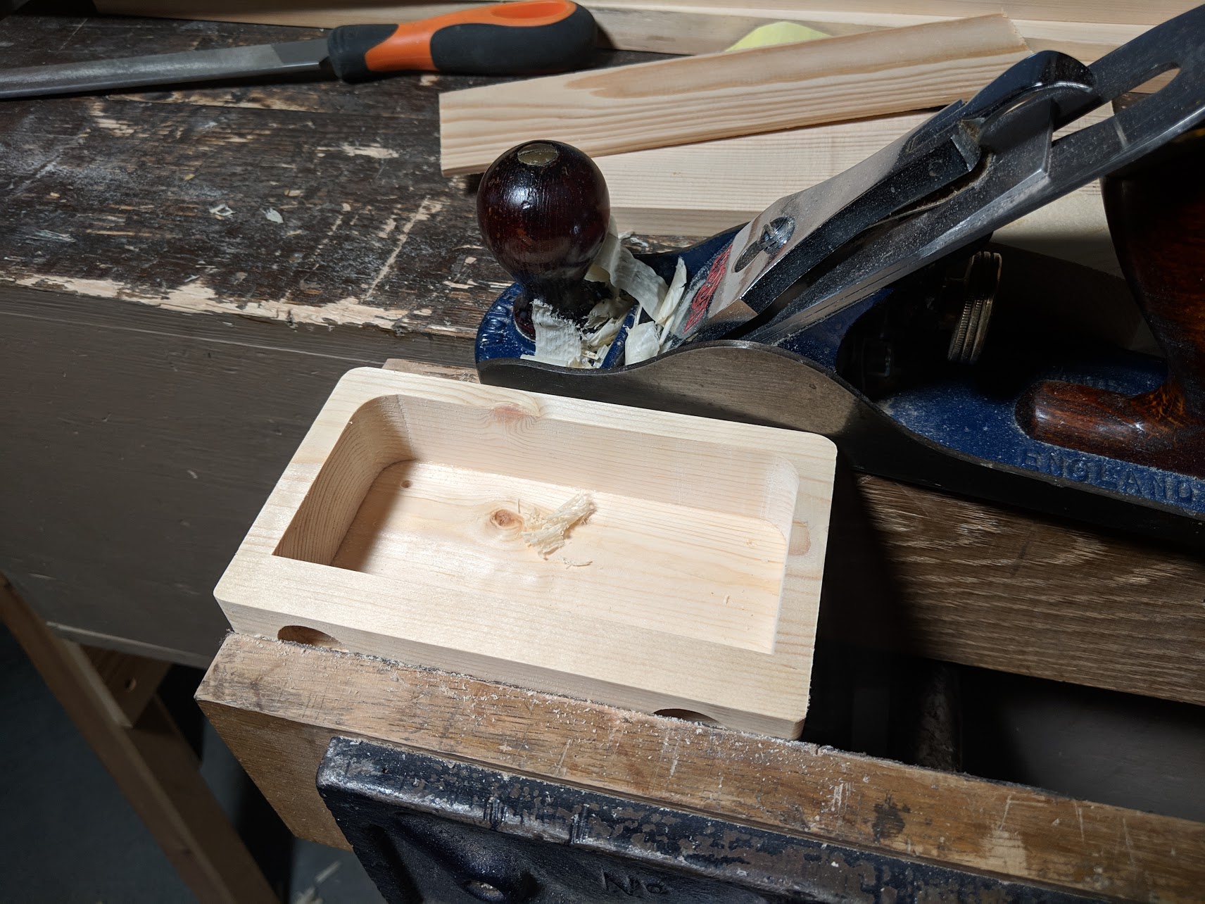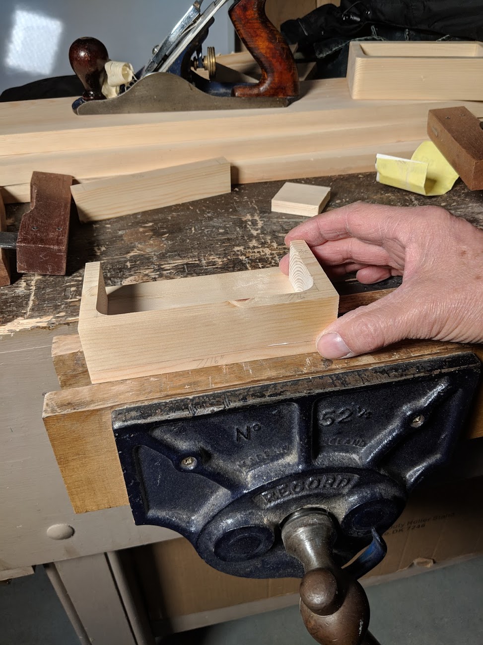 Plane the two mating surfaces smooth if you want to, otherwise they can remain as bandsawn surfaces. (Strictly speaking, the bandsaw box meeting surfaces are generally left as bandsaw cuts without hand tool refinement but this project lends itself to perfecting the joint lines and it is good practice.)