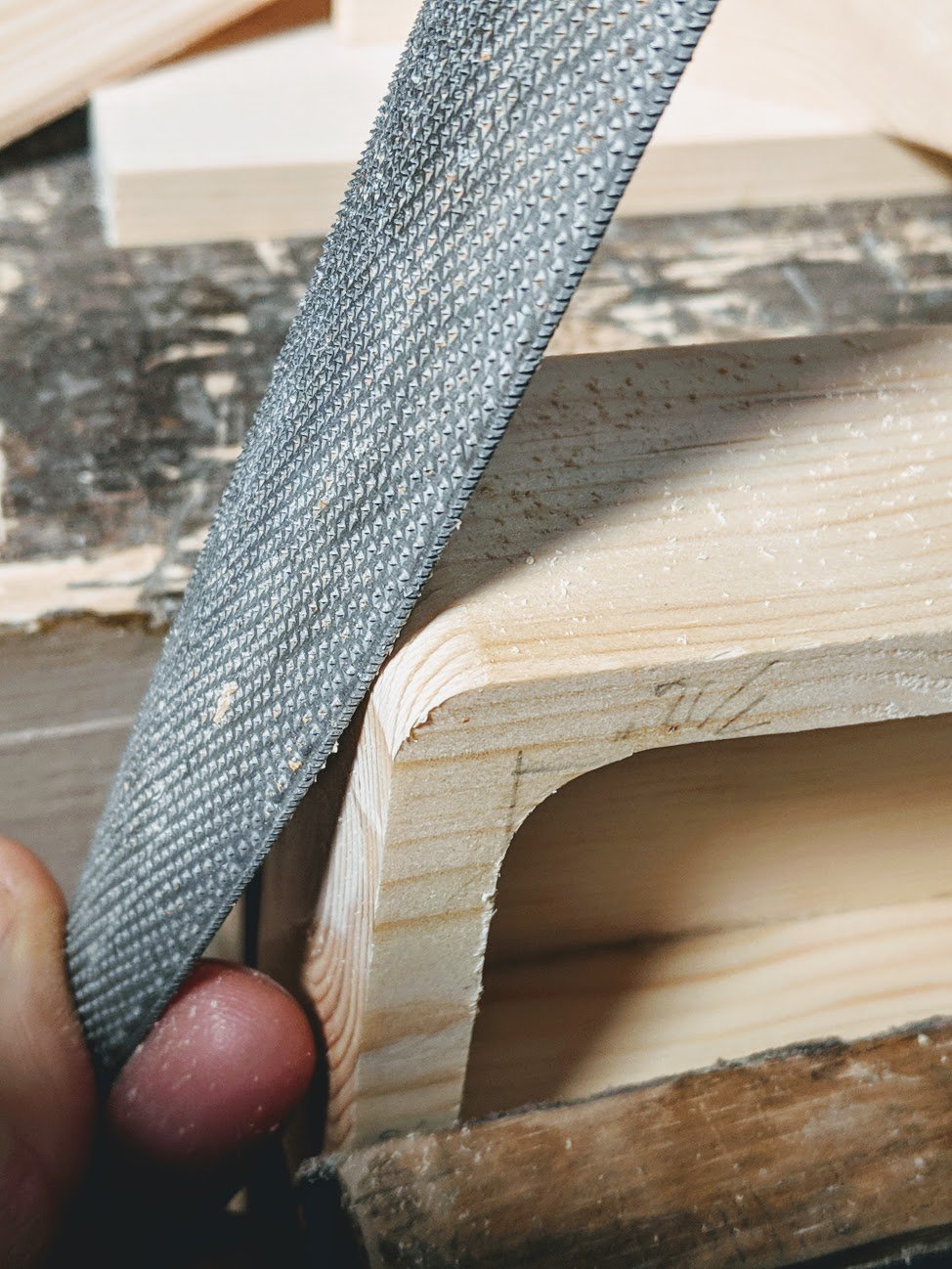 Shaping the front corners reduces the risk of snagging.Start by removing the corners at 45-degrees with a rasp, file, chisel or plane.