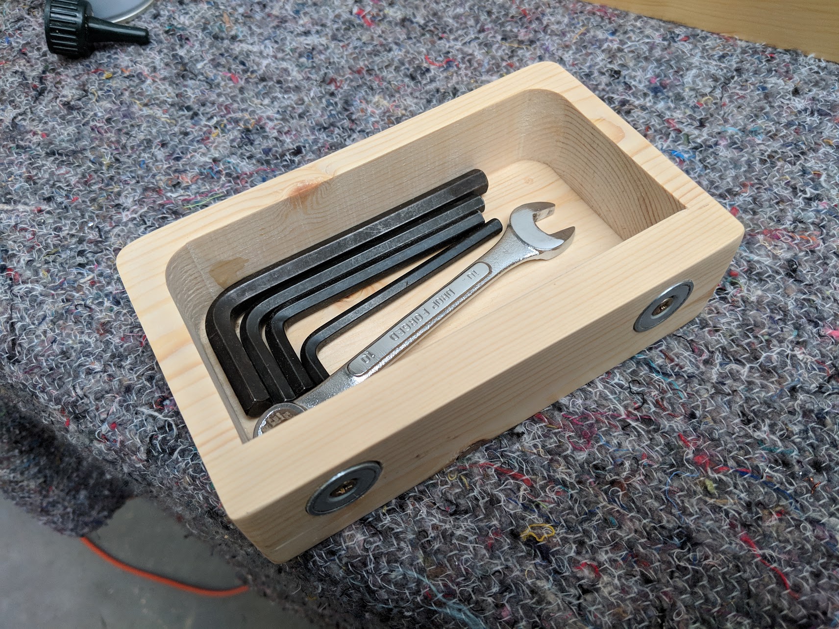 Someone said, "I don't mind you using a bandsaw in your videos so long as you don't make another of those bandsaw boxes!", so I did. Hannah had brought me a wire metal version of a magnetic container intended for a fridge and I liked its usefulness for keeping wrenches like spanners and Allen keys. I needed a second and a third because of their handiness so I made them using the bandsaw box making method. They are fast to make, super strong and everything shrinks appropriately in the right direction. I added my magnets from eBay and hey presto. Right where and when you need them.