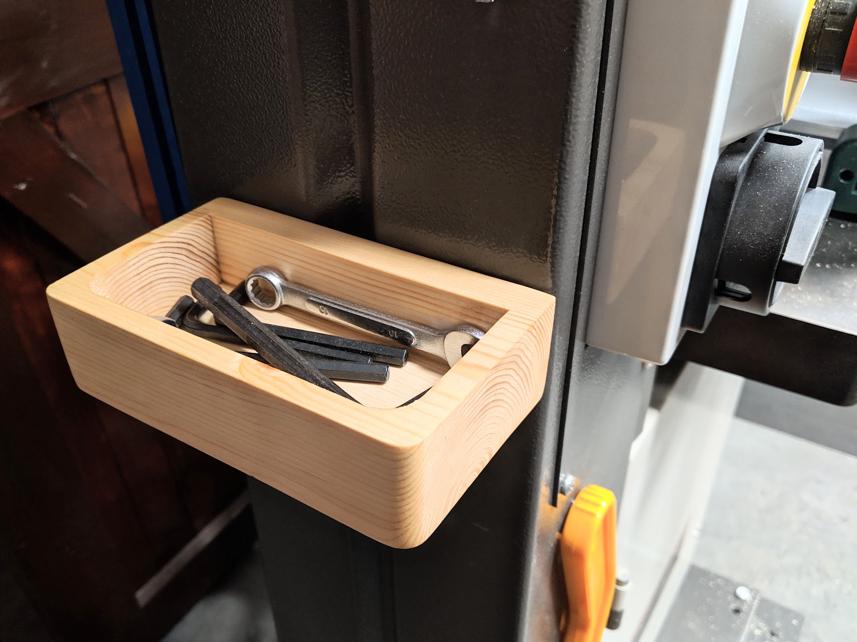 Make certain to consider safety surrounding its location. The idea of the tray is good stowage and accessibility and then its relocating ability. I would not for instance hang the box on the front upper area above the cutting blade even though my magnets are exceptionally strong and the tray does not move. Vibration will effectively move anything given time. Low, below the table and to my left works well for me. Generally we will have always unplugged the machine from the electricity before we make any adjustments. I hang mine on the rim of my bandsaw table when adjusting roller bearings and guides etc.I then move it to a permanent location as discussed.