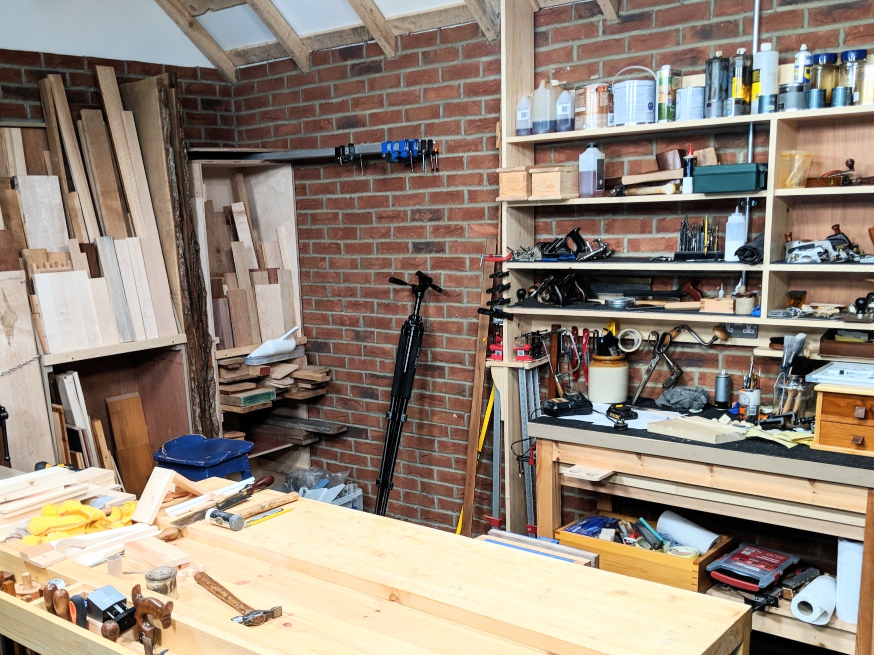 What I have enjoyed with this garage space over any other is just taking my time a bit more than with the previous ones and then customising the innards thoughtfully—even to the point of creating working drawings for things too. In the past the demands of providing for a family with four boys still at home meant setting up ASAP and getting into production. The garage shelving in my background is no more and no less than I want. I have little passage area with storage to take the extra gear I need because of making the videos work. I cannot just nip out for that extra special brass screw or hook or fastening when we have three people hinged to a camera set up. I carry a pretty varied stock. I also carry more wood beyond my garage space because again I need to have a selection in so that nothing is held up. In some ways the garage represents exactly how I am in my woodworking and reflects some of my happiest days fro half a decade ago. today it is how I want to work for the rest of my life. It's real, unintrusive, simple and clean. I love it.Will I add other machines like power planers and tablesaws? No. That's all past. I have worked out exactly what areas of woodworking I love the most. I will never go back to what was offered with a full machine shop as part of my production. Even with filming, were I to sell what I can make in a week with my bandsaw and hand tools I can make a very good living. Enough to provide for a family of six people. I believe that, but I do understand that others might not or might not have that as an ambition at all.