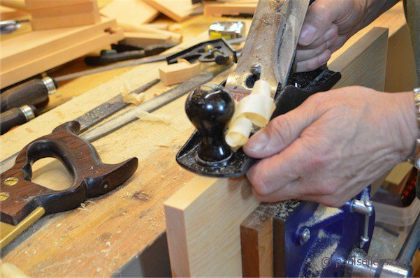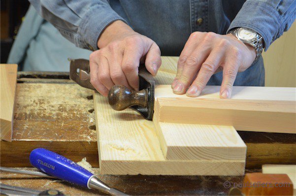 The first thing George did was make me clean up all the faces with a #4 smoother, one he had loaned me at the start of my apprenticeship. We used a tenon saw for cross cutting and a shooting board for squaring the ends. These were fundamental methods that would always remain with me as foundational. I felt clumsy and George said, "Own your plane!. Grip more loosely. Smooth out your action. Press confidently only when you have confidence to work with."