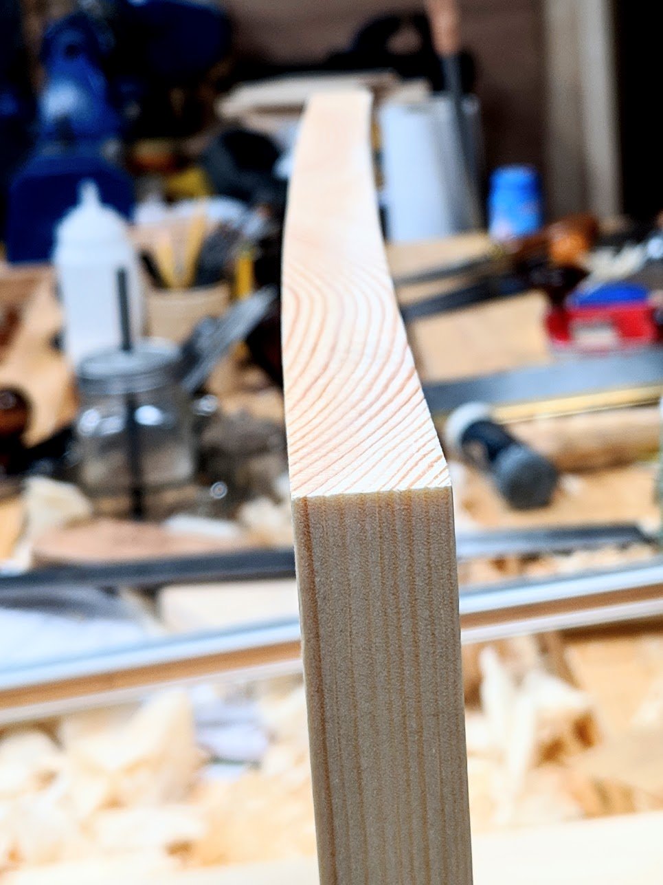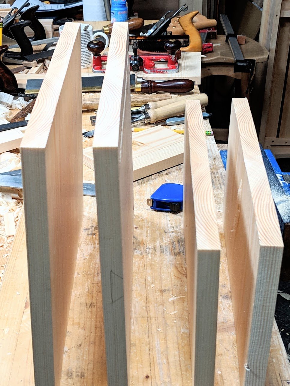 One thing I have learned through the years is that joints constrain wood and rarely does the wood have the power to resist the power of goo joinery. I had glued up my panels before I left for home last night. I had cut them to panel size and left them loose on the bench top. In the morning the topmost board had cup-curved with 1/4" crown over the 15" span.