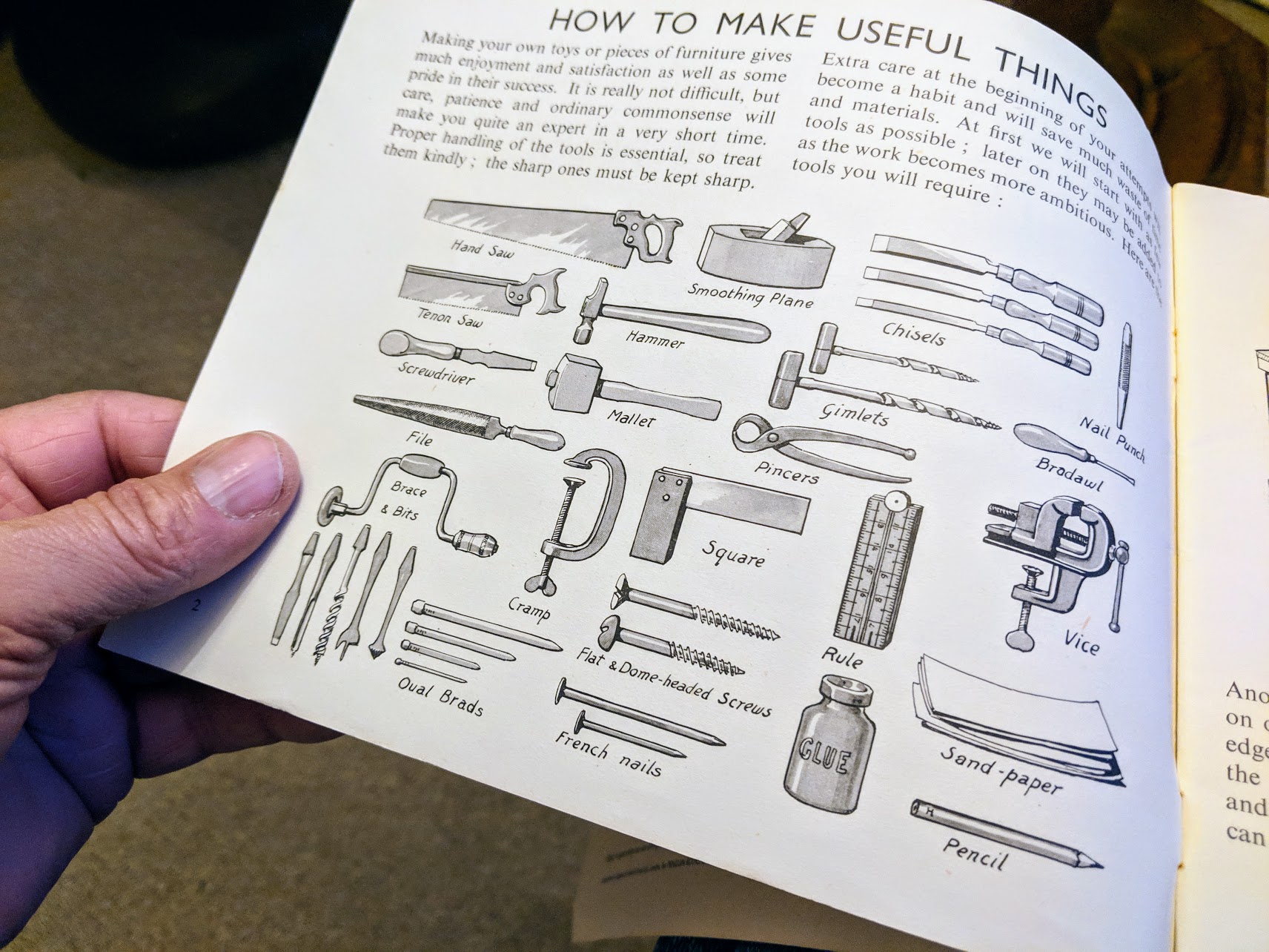This book was reprinted as a revised edition in 1946 so originally it was a mid 1940s book. What were the expectations of the author and the publisher in that time? Was this realistically targeted or perhaps more aspirational? It seems intended for home use rather than schools. Schools didn't start woodworking until around 12-13 years and it was boys only in schools for the main part until 1970s???