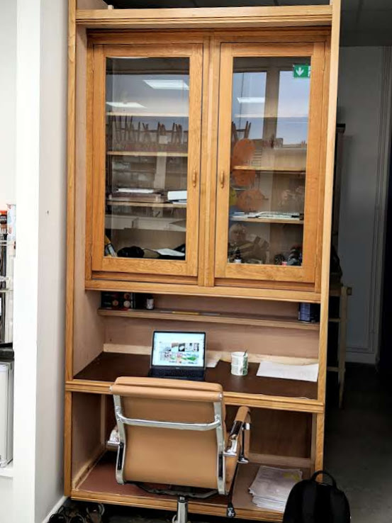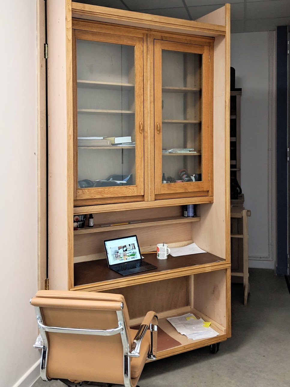 I have been building a working desk bit by bit, to incorporate my oak cupboards additional shelving etc. It's on some very substantial wheels and rotates 270 degrees from its hinged corner. That way I can disappear from the more the public office area to any position on the arc to all the way around the corner and into my office proper.