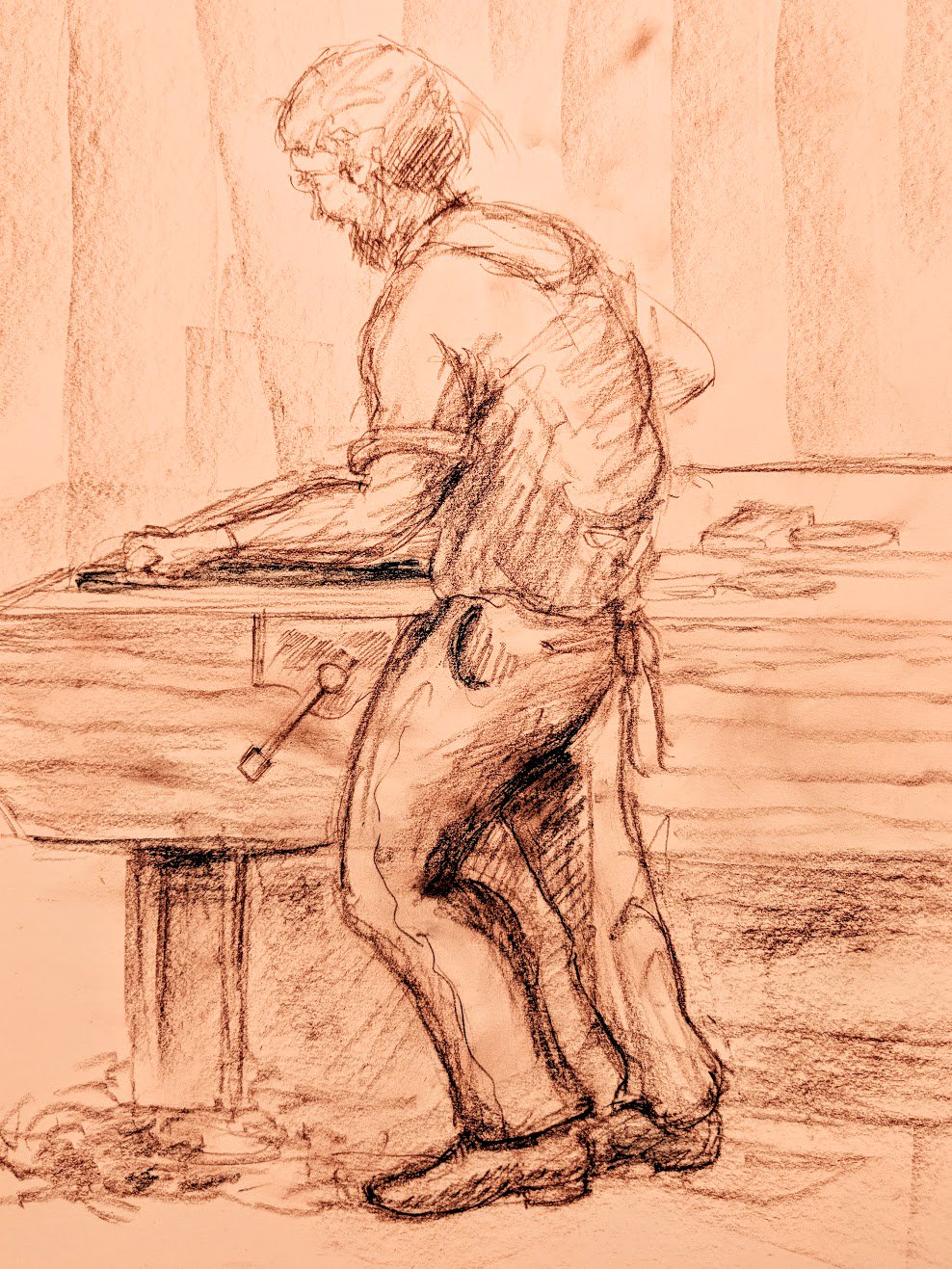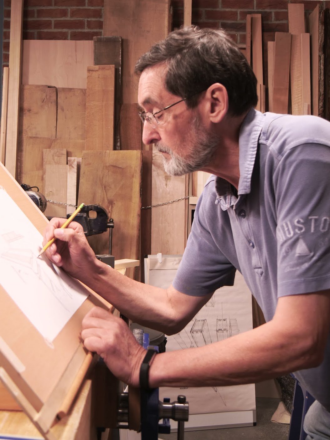 Mostly the vise corner of my workbench and then too the jaws of that same vise I have owned and worked from for almost five decades now, when my early works began, has been the core of fusion between my drawn images and the joinered work in the making of pieces. The tip of #2 Ticonderoga pencil, Walmart #2 12 pack sketched and drew 90% of what I envisaged in creating both my rough drafts and my perspective briefs, technical drawings and notes. Imagine that. Never a computer! Me just standing mostly by an old and secondhand rough vise!