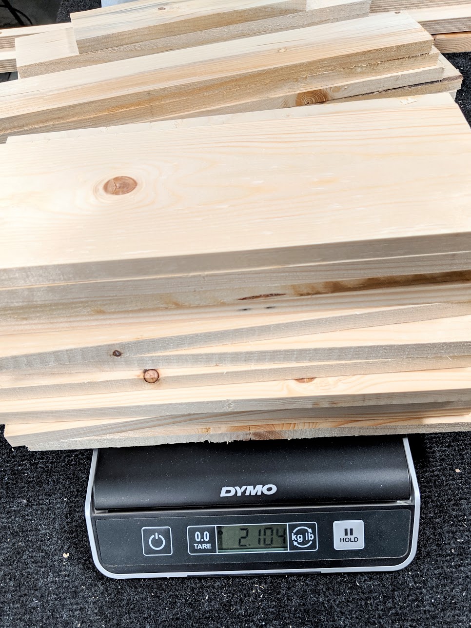 I say decreasing because most pallets will come from outdoors somewhere so taking them into a drier environment, perhaps with controlled climate, the weight will diminish as the wood releases its moisture naturally. Weighing several pieces, stickering or cross aligning as shown, allows the air to circulate across the faces of the wood too. This speeds up the drying or acclimating process on small sections like this and usually, inside a week or so, the weight loss gets less until it constancy is achieved. The wood from these two small pallets will make several small boxes like my candle box.