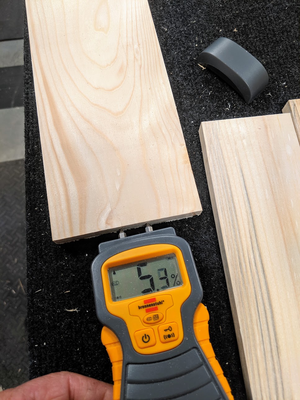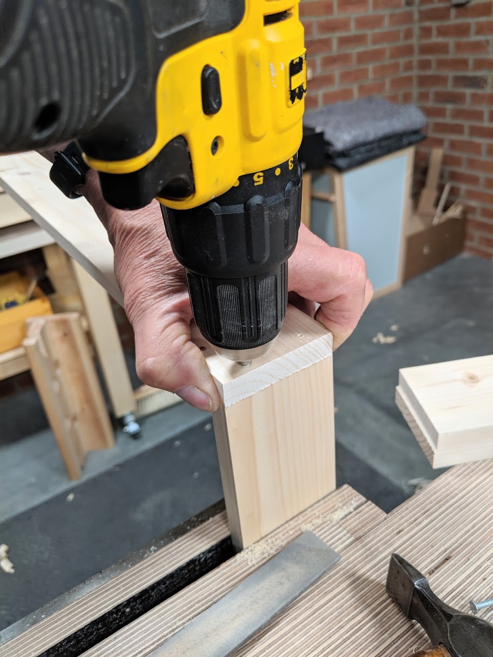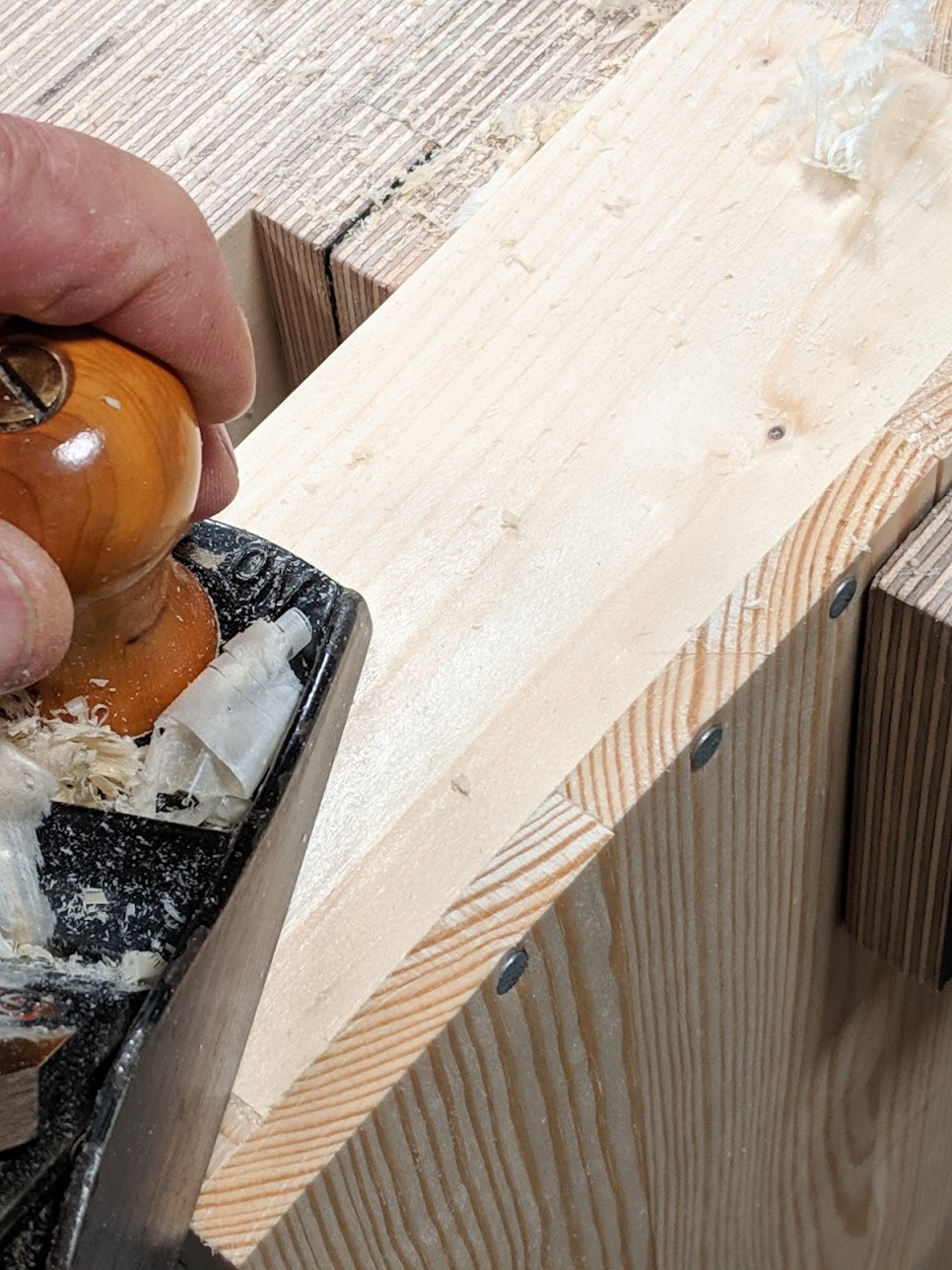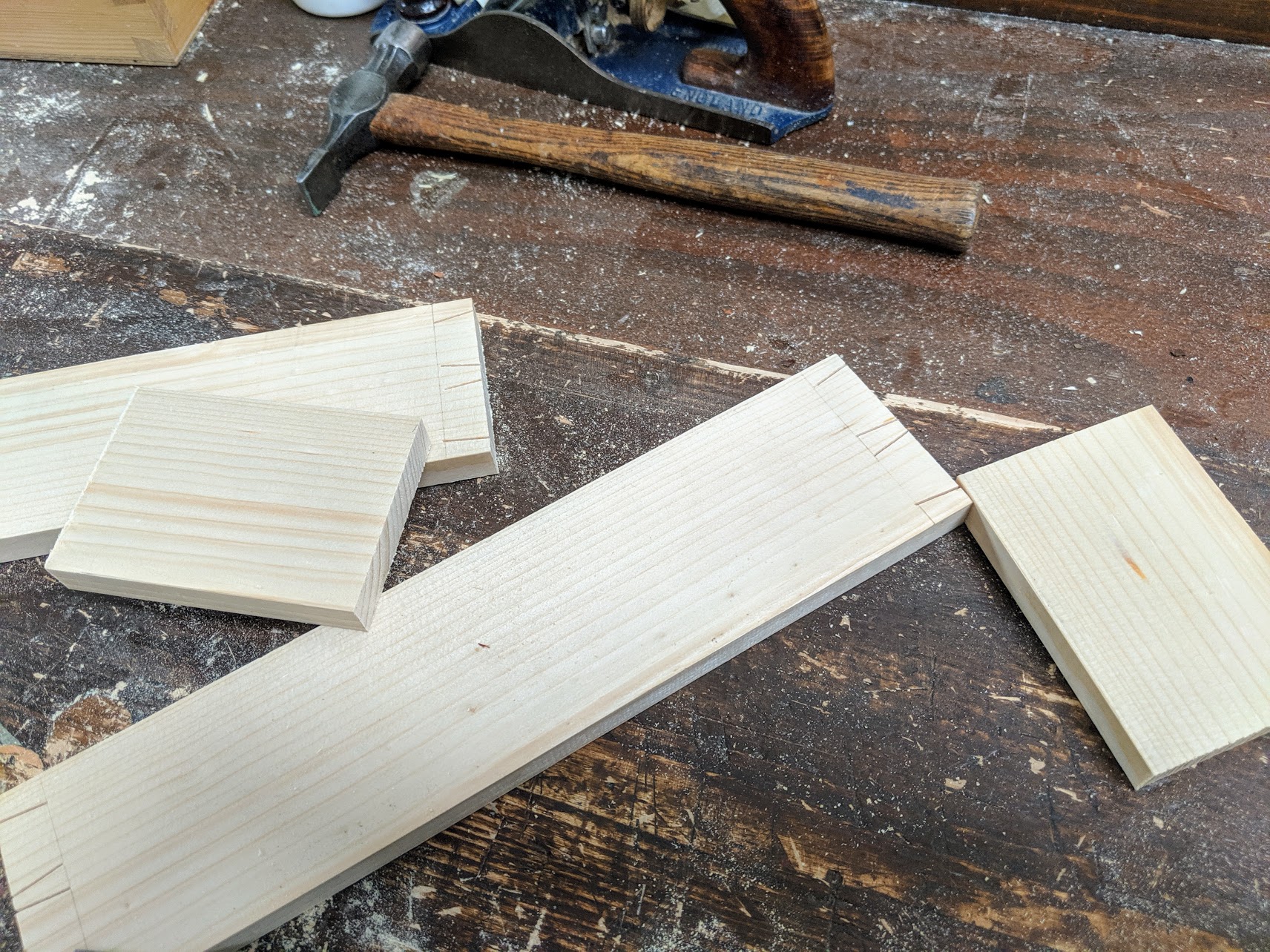 I was quite fortunate because the grain moisture levels were already low when I first cut into the pallets. After a couple of days in in the workshop, stacked as said, this type of wood readily gives out its moisture. When I began the joinery my wood measured around 5 - 6.5 percent when checked in via end-grain cuts. No likely shifts in that going forward so no worries with regards to either shrinkage or expansion. The key to working any softwood, and that's just about all of the softwoods from coniferous the forests and woodlands we get from more temperate zones, is the sharpness of our tools. Without this sharpness we cannot hope to get the crisp lines at the shoulders where one part of the joint unites to the other. It is well worth going all the way to 10,000 on the strop. Also key is the knifewall. Again start out with a sharp knife and the lines will meet perfectly and also give you the accuracy you are striving for. It's also a good idea to use much less force via the chisel hammer as this will compress the fibres and move the knife wall which will show as a gap. I will often use just my fist, the side of it, as an initial entry into the wood, and then, as the cuts deepen, revert to the chisel hammer. This will be enjoyable for you!