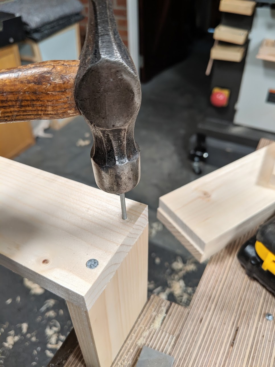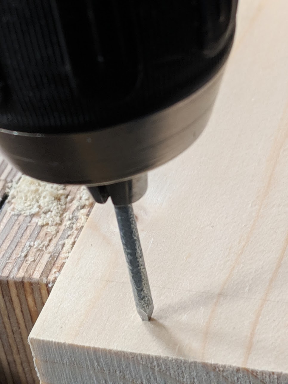 Pre-drilling with a same-sized nail used for nailing stops the wood from splitting even when directly near the ends of side pieces and bottoms as shown. Simply file the pyramid point to create sharper corners to the point first and away you go. This works with small pins and large nails too: four inch even. Try it!