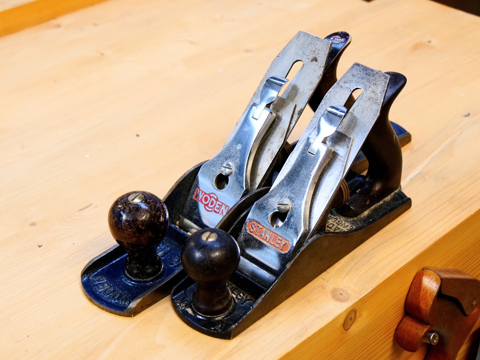 There are levels of sharpness that I use. In my videos, if you see me sharpening up, you see me go through my recommended four levels in quick succession. Three stones and a strop charged with abrasive compound is fast and effective. In under a minute I have my plane or chisel sharpened. A saw takes me four to six minutes and I never put sharpening off no matter the rush - it just does not pay. But I don't always sharpen my edge tools to the 10,000 or more level. It depends on the work in hand. For instance, though a scrub plane might be engaged in scrubbing off large amounts to get down through the grain, sometimes I might not go to another level because it's unnecessary. Using the scrub to bevel corners in an instant, or planing a narrow edge where the edge is not needed to be united to another as i gluing up. At my bench you will generally only three favoured planes I reach for in a given day. I have the scrub plane, the jack #5 and the smoother #4. Tucked away but still close to hand I have a #5 1/2 and a #4 1/2. Behind me I have a couple of extras of each and then a couple of Veritas bevel-ups.