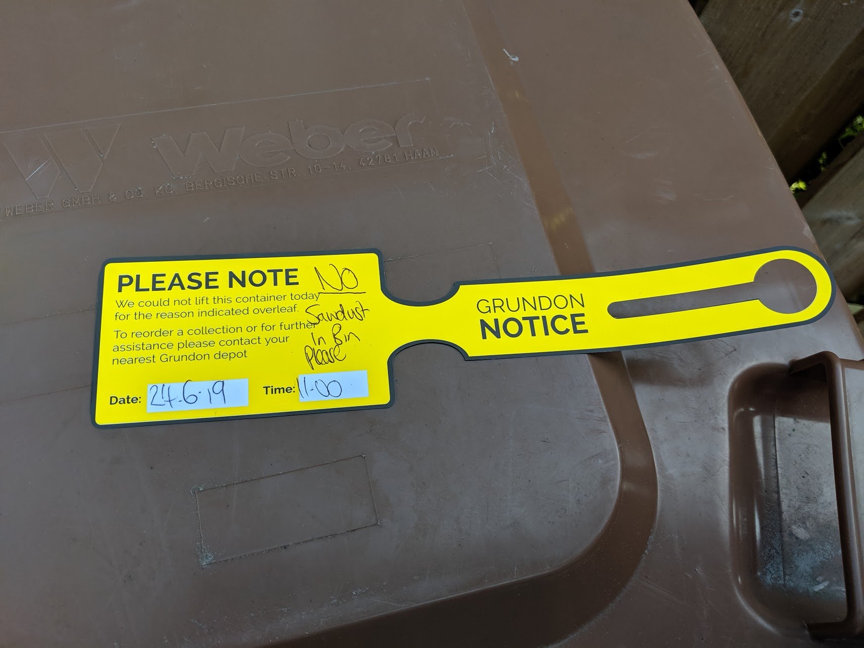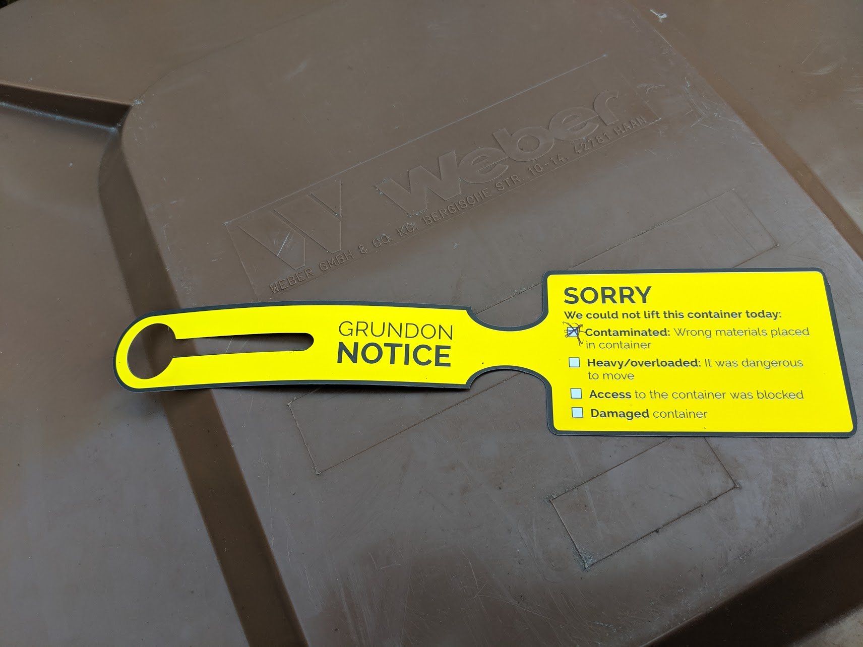 It works wonderfully. Well, this week this yellow tag was fastened to my wheelie bin.