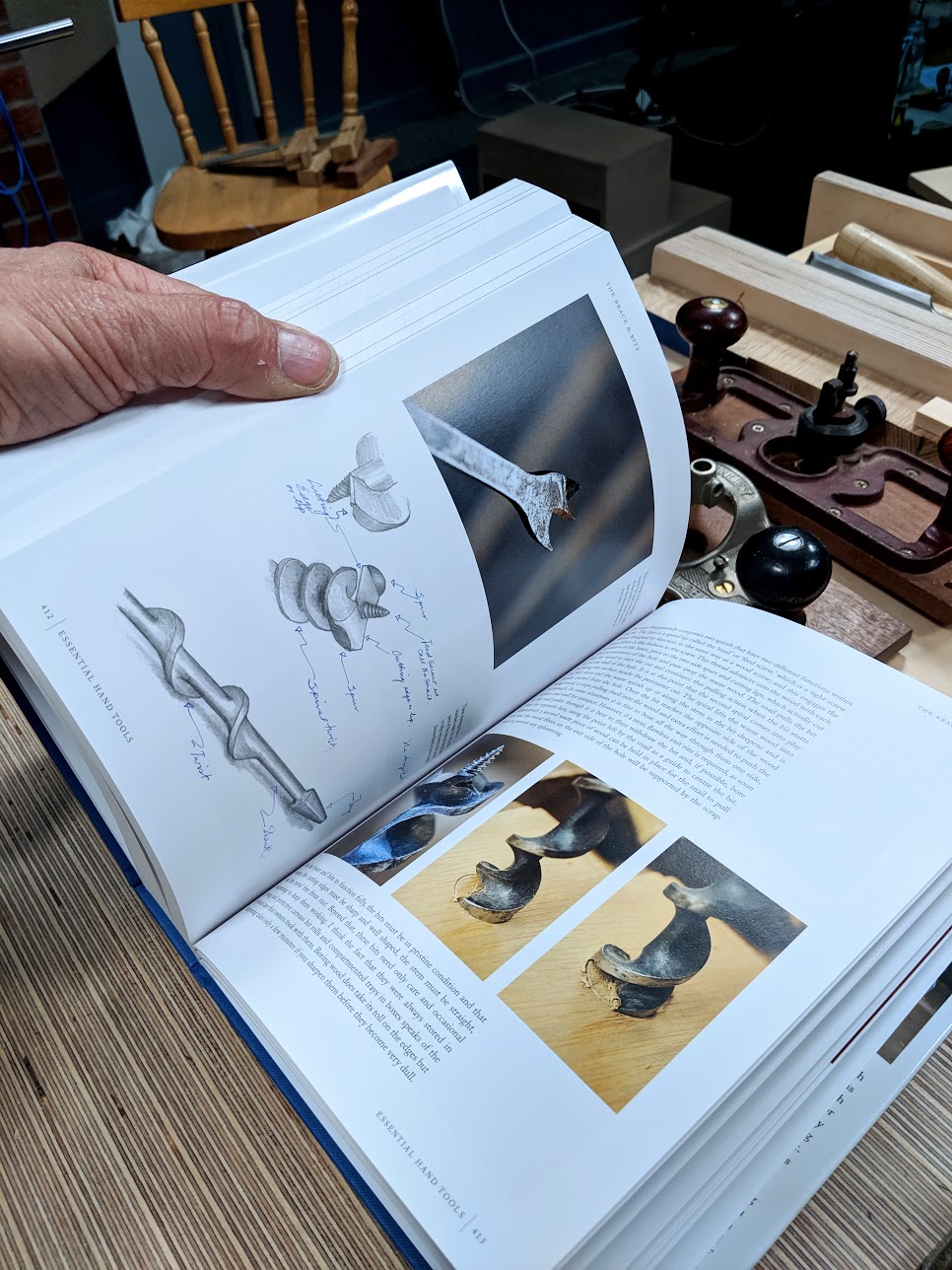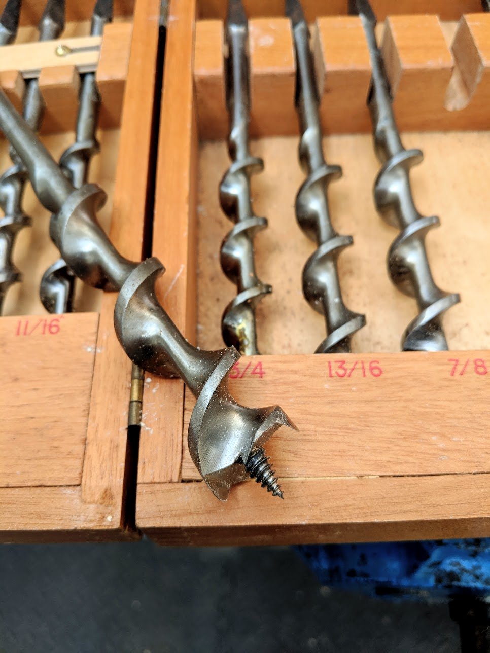One of my more senior apprentices was boring a 1" hole every few inches as he made one aspect of a dog-leg element of a staircase string to receive some fanned out stair treads that went into the newel post. The posts were oak and George caught a glimpse of Ian struggling to get the bit to work on one or two intermittent occasions.