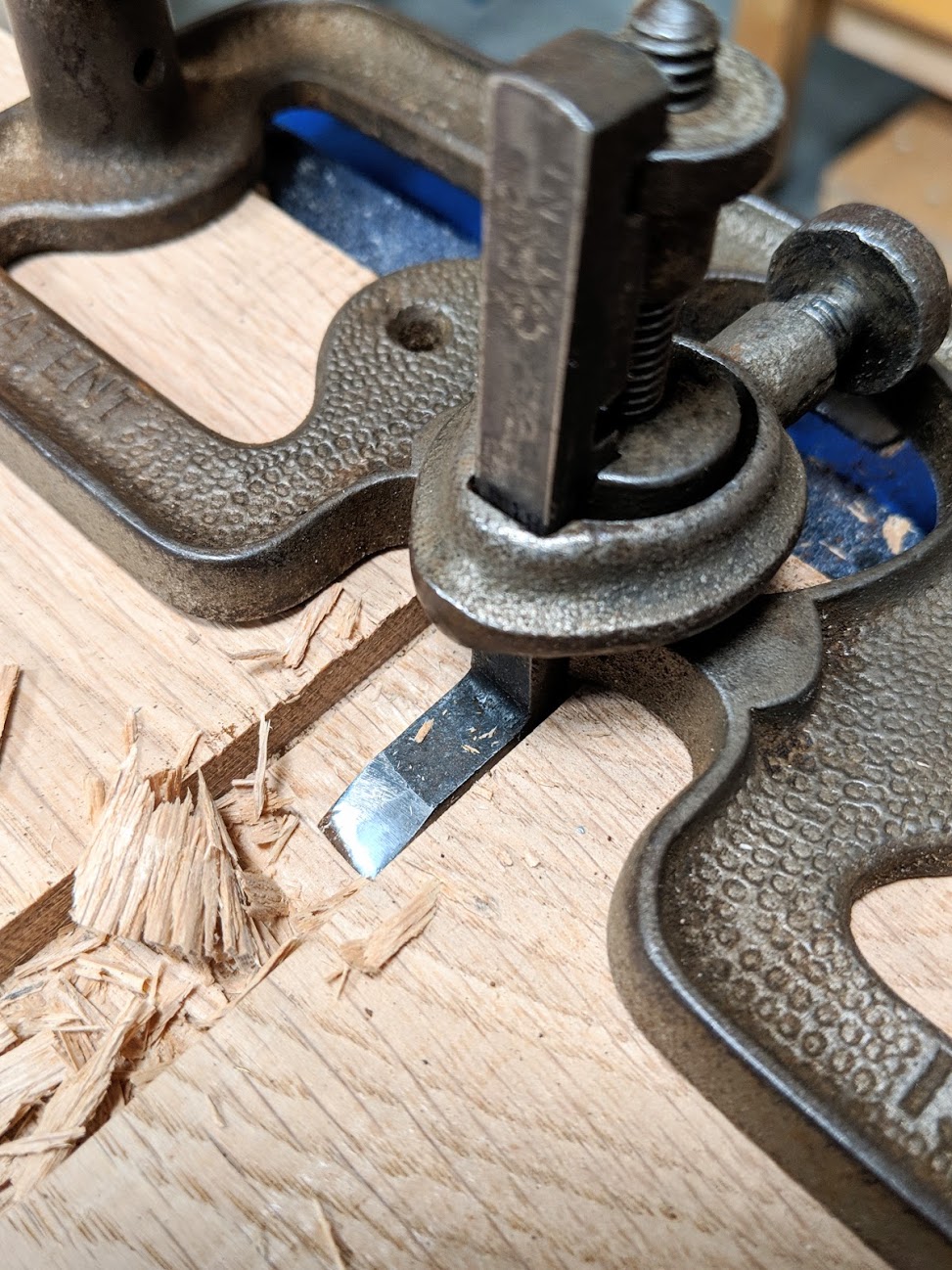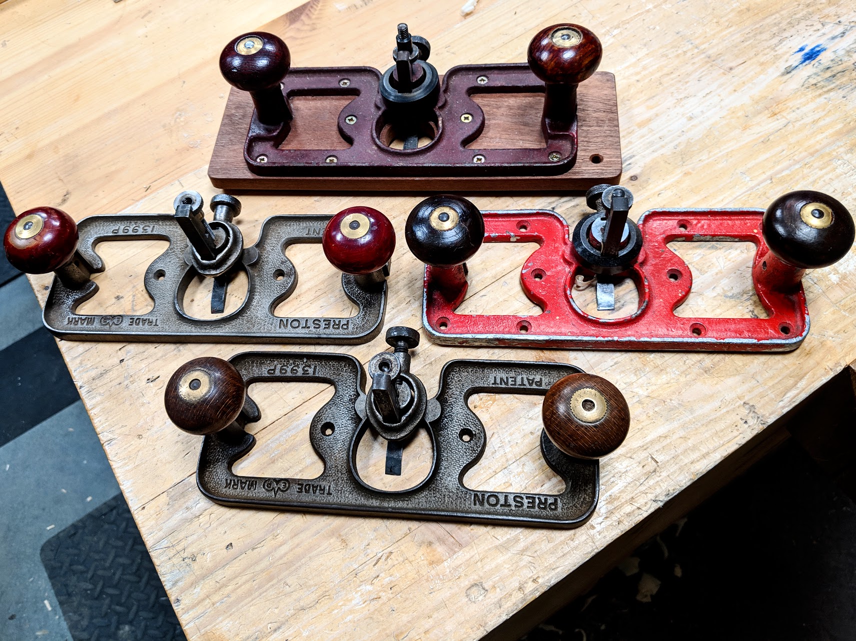 The hump in front of the cutting iron is well worth having even if you negate its functionality by adding the wooden sole. It's this feature alone that betters the Preston-style version really. Of course putting the cutting iron outboard as shown enables you to plane into a stopped housing dado and all of the router planes have this feature anyway.