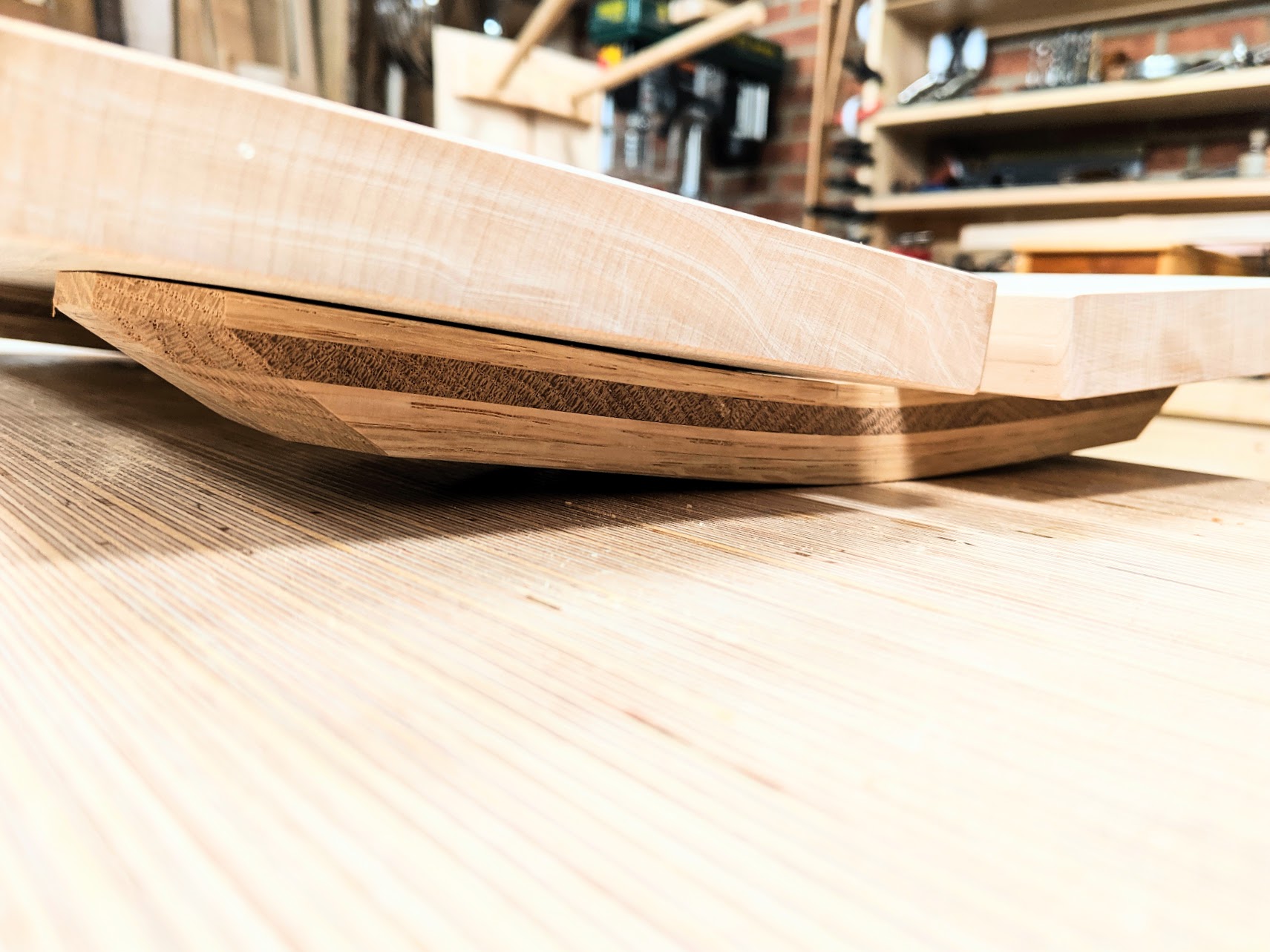 If this is indeed a first lamination project for you it is a great starter piece. Once you have laminated the bearers, left them overnight for the glue to fully dry and cure, turn them over, pinnacle point uppermost and stand on the point. You'll be surprised at the resilience of the lamination. I know, some will say why not just cut the vee on the bandsaw. That's for the unadventuresome. Leave them to their own and join us a laminating adventure. Think white water rafting!