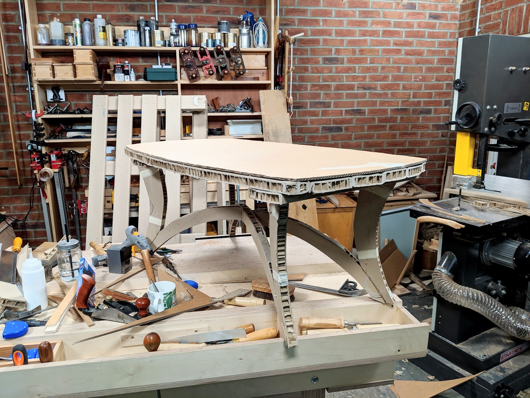 So we now see that mock-ups give is a solid. Something so solid we can consider it when it's placed in the room. Shape, proportion and size alone can be seen visually and considered initially for this purpose but then we must investigate the inner options we have to play with - the joinery. This happens mainly when we stray from the rectilinear standards where 90-degree corners and intersections would typically come from the more general three-joint-choice-standard of mortise and tenon, housing dado and dovetail. In general these joints almost always rely on square shoulder lines abutting into stiles, posts and panel sides of one kind or another. Straying from such norms demands that we rethink our option and when we think of using lamination as a process to achieve our objective we must truly go to the drawing board to invent possibly what has not yet been invented.