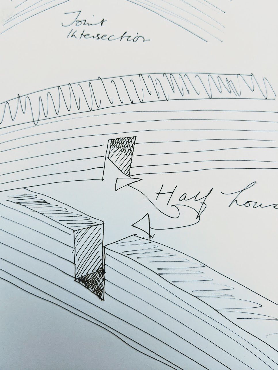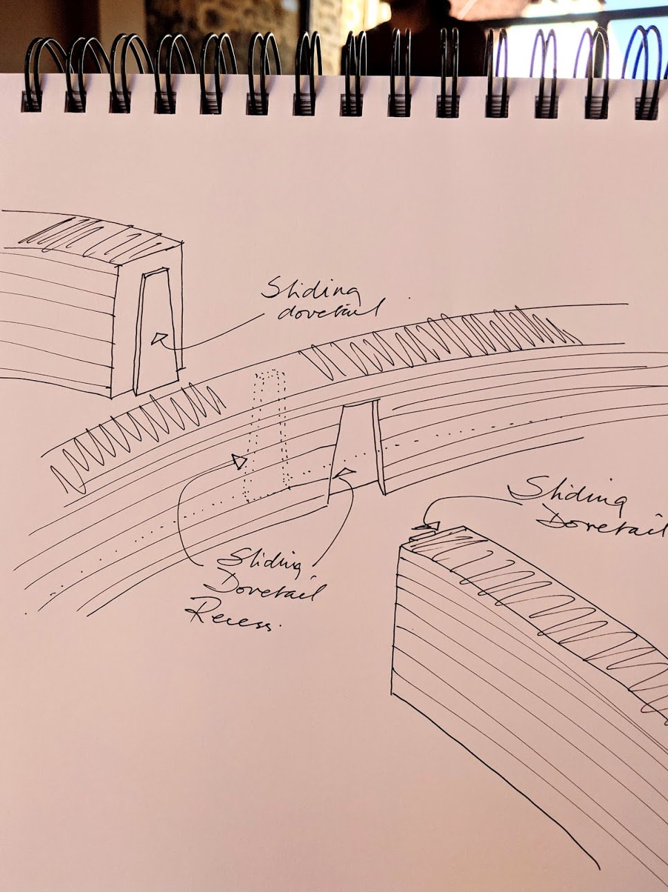 I use drawings in the same way I record or write down a sentence to capture a thought I want to expand on later. When I am at the bench my note pad is an offcut of wood , a shavings even. It makes it to my note pad and journals and are always kept as a record of shifts and changes I've made along the way. You see, just the same way a passage you are writing can change potency when you stray from an original thought, so too a design. Sketches seem somehow to capture changes, they have the ability to encapsulate and protect original intent. In my view that's important. It doesn't mean change cannot take place or even be welcomed, just that the evolving process ensures a projects success. As an instance I may have an idea for shapes but when I come to the joining of components the materials may not allow the initial thoughts surrounding the joinery. because it's impractical for one good reason or another. Something may well need to shift and I may need to change an angle or a component size or the very joint I thought might work altogether. An intersection may look as I want it to look, but then inside I may change a halving joint to a sliding dovetail to make it happen. From the outside the intersection looks identical, but the inside of the jointed area is absolutely different.