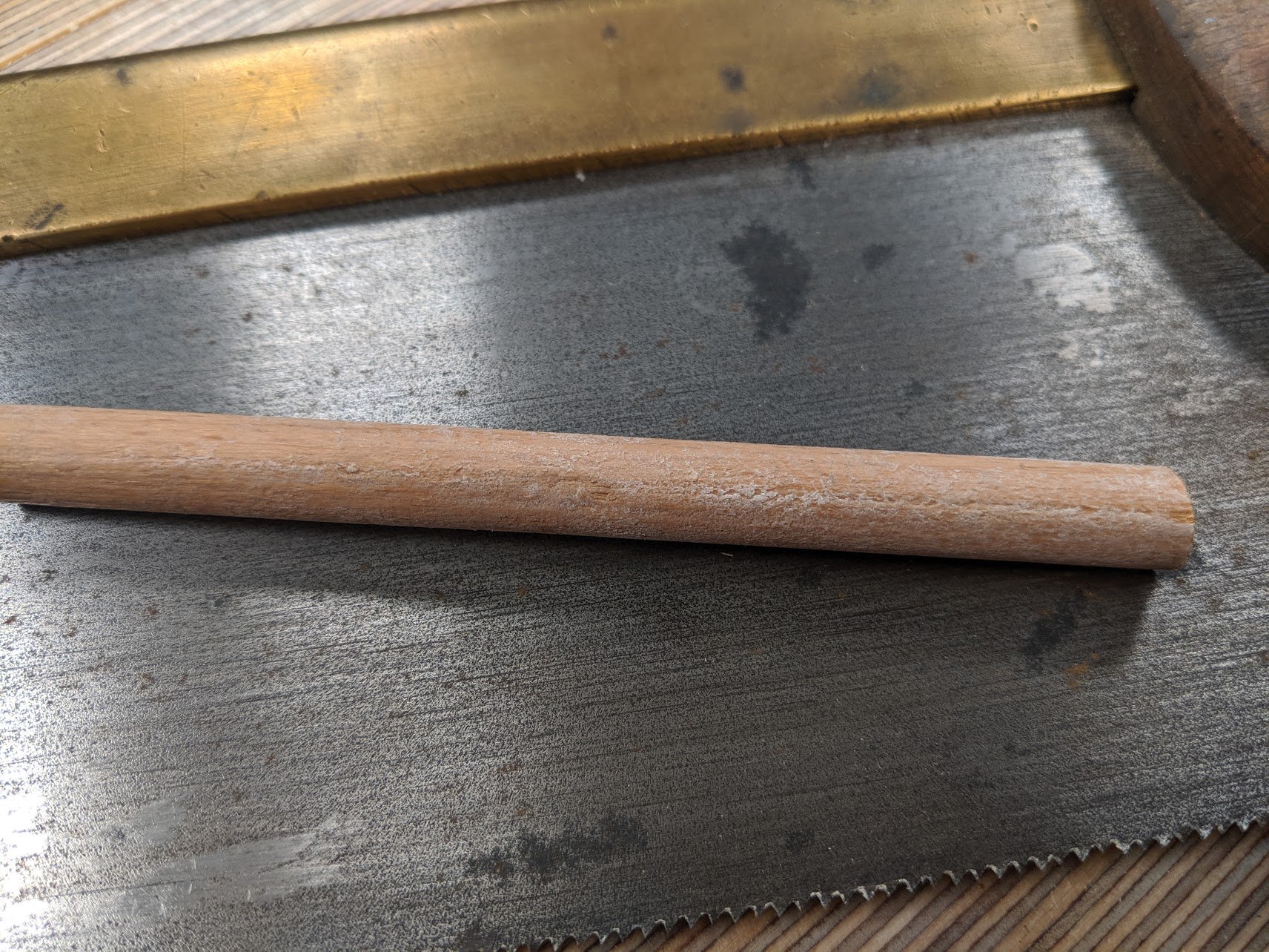 Spear & Jackson, as well known for its connecting ampersand between the two names and rarely seen arranged with an 'and', developed the spindle of 10mm beech rod to pass straight through the closed handle of their saws to add cross grain strength to what is a weak point in saws.