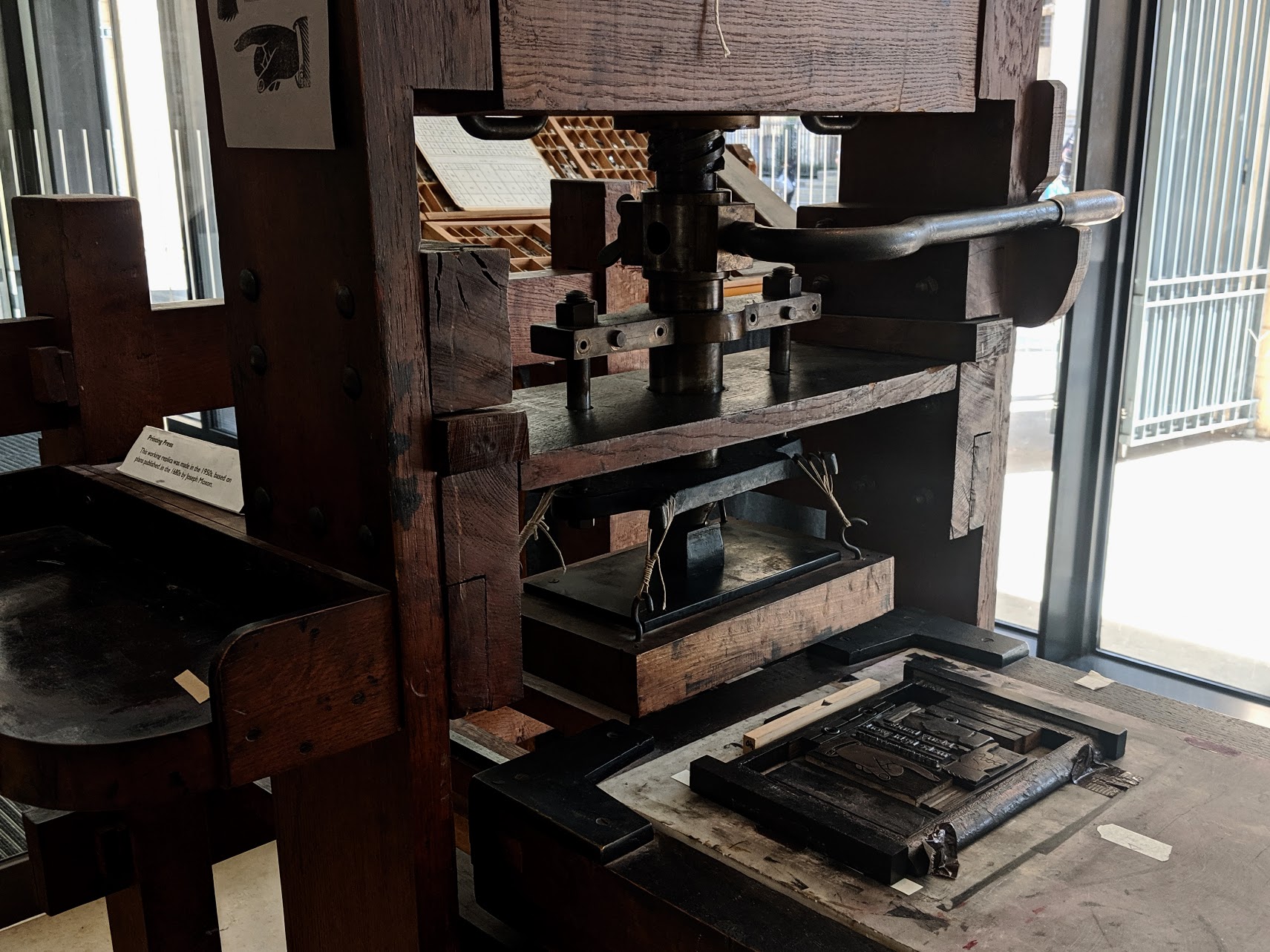 I enjoyed looking at the mechanisms of the press and would have enjoyed turning the handle a few revolutions too. Alas, I could only stop and stare for a while. Wood was replaced by lead that could be remoulded when definition was lost to the papers coarse impact. Wood must be carved afresh. Such would be the demise of the wood crafting artisan yet again.