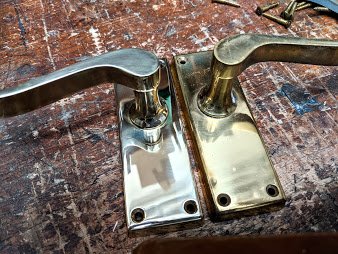 The door has been freshly painted and indeed the living room itself has several elements of restoration to make it the backdrop for making furniture for. To say that the handles lacked lustre is an understatement. I decided they needed either replacing or restoring so I took them to the garage and cut through the grunge to bare metal again. I polished them further with buffing compound and they seemed to me to be transformed. In the process I felt my spirits lift too - polished if you like.