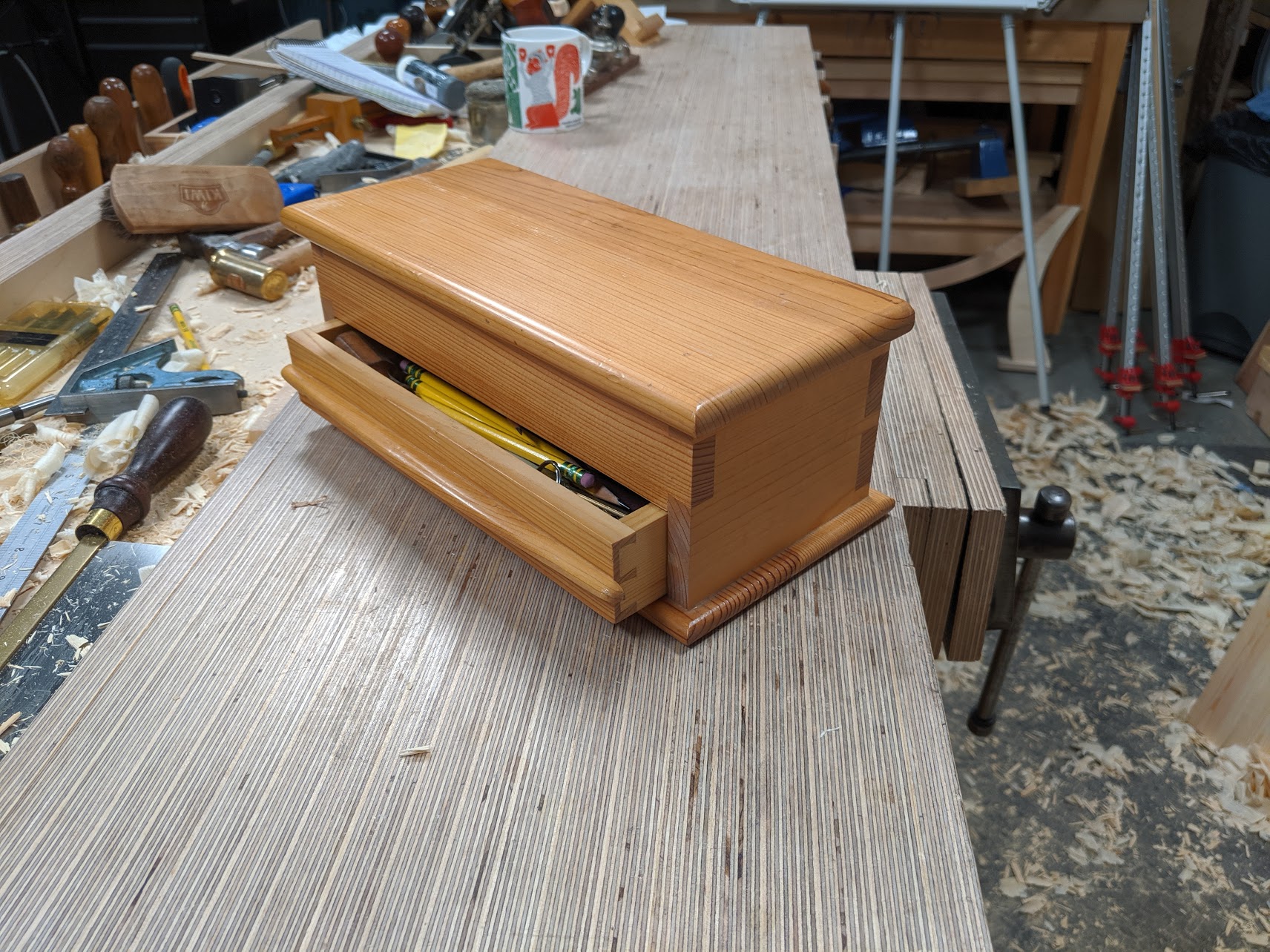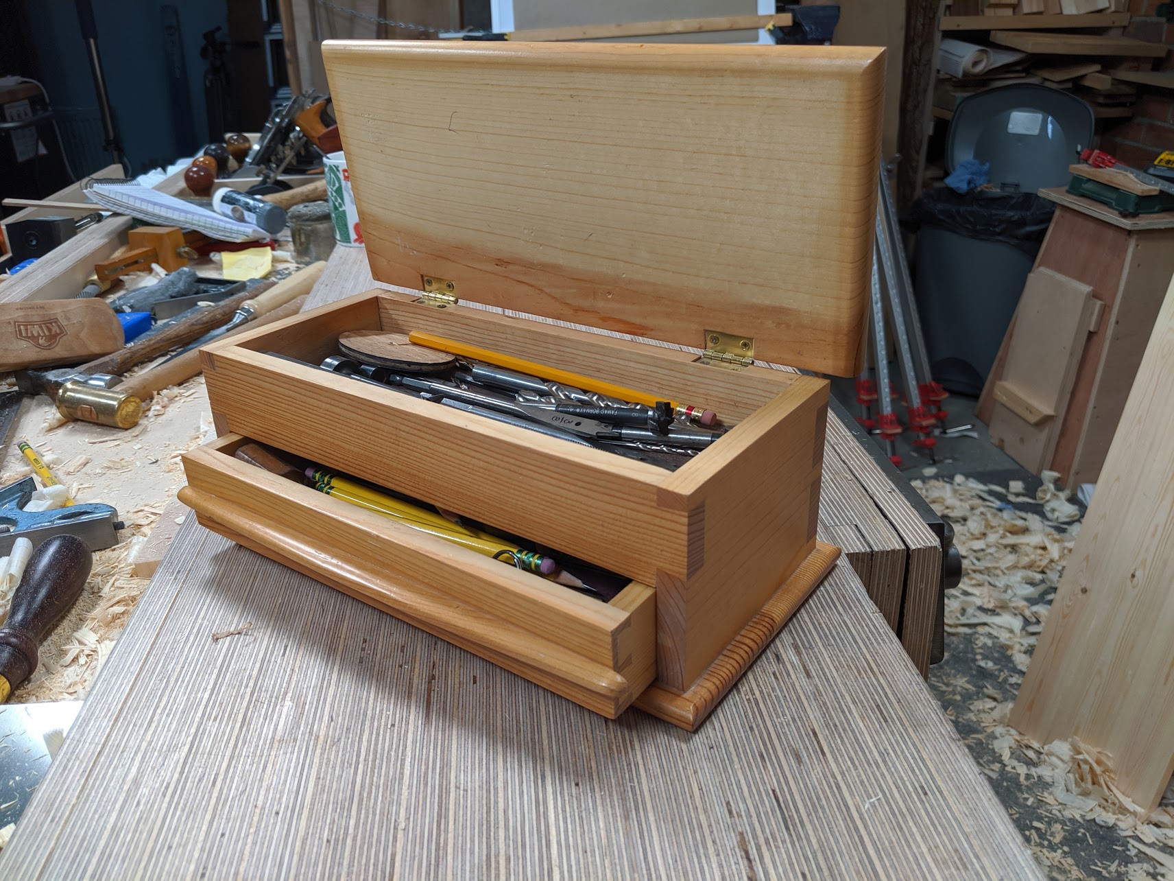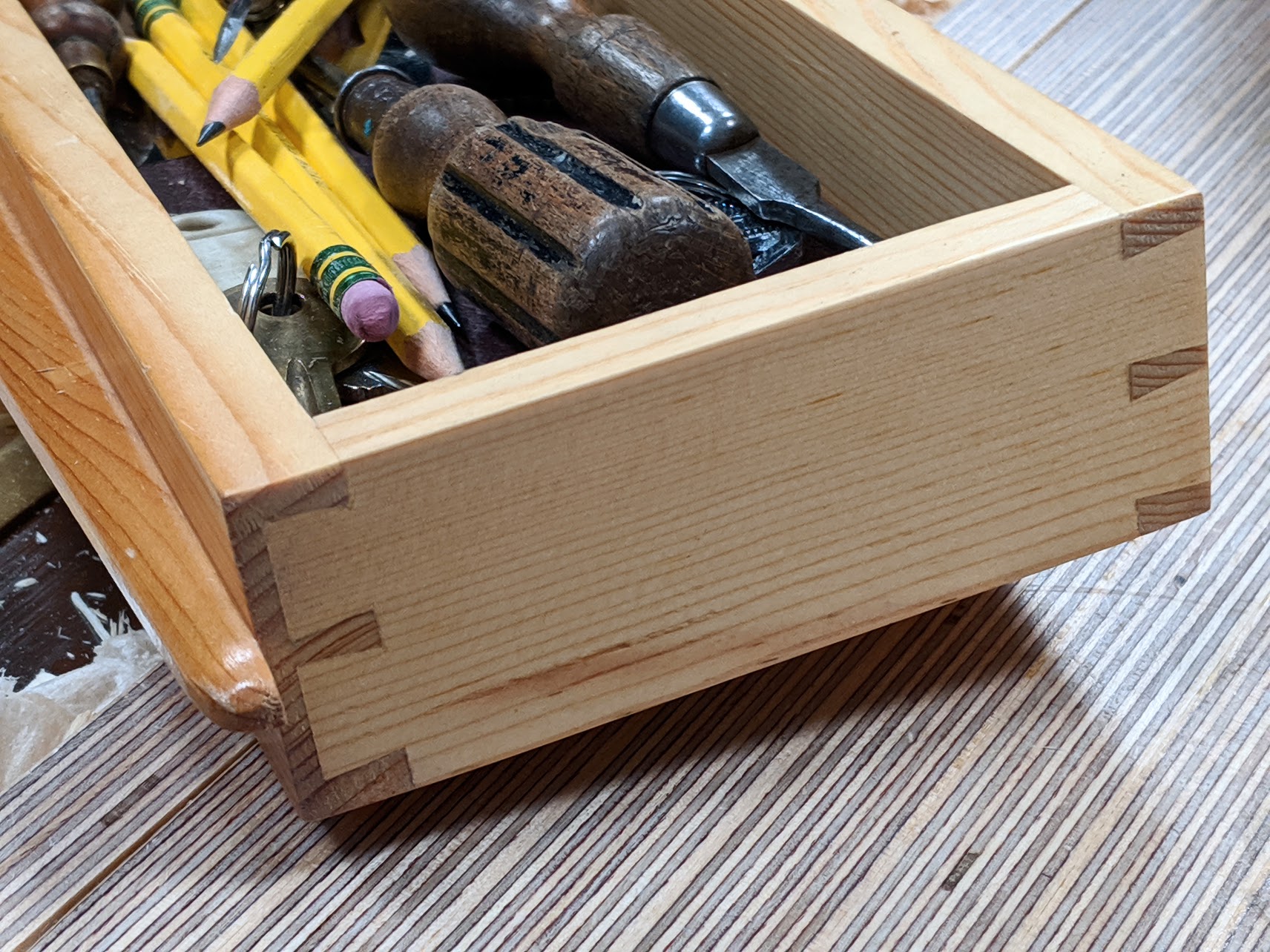 Here's a project I made years ago when I lived in TexasHill Country, two decades at least, and one I really enjoy having for my small stuff like drill bits, pencils and pens, special-to-me screwdrivers and hand tools and and so on. If you have made my Shaker dovetailed candle box, as have thousands of others who have been on my courses with me, then you will see that this is an alternative, more advanced composition with a dovetailed drawer. I designed it to teach drawer making but the small proportions make it just a little more tricky.