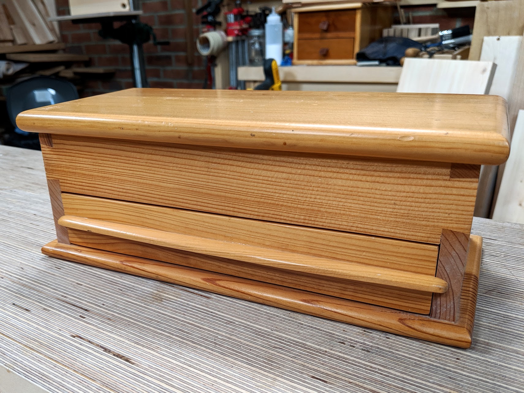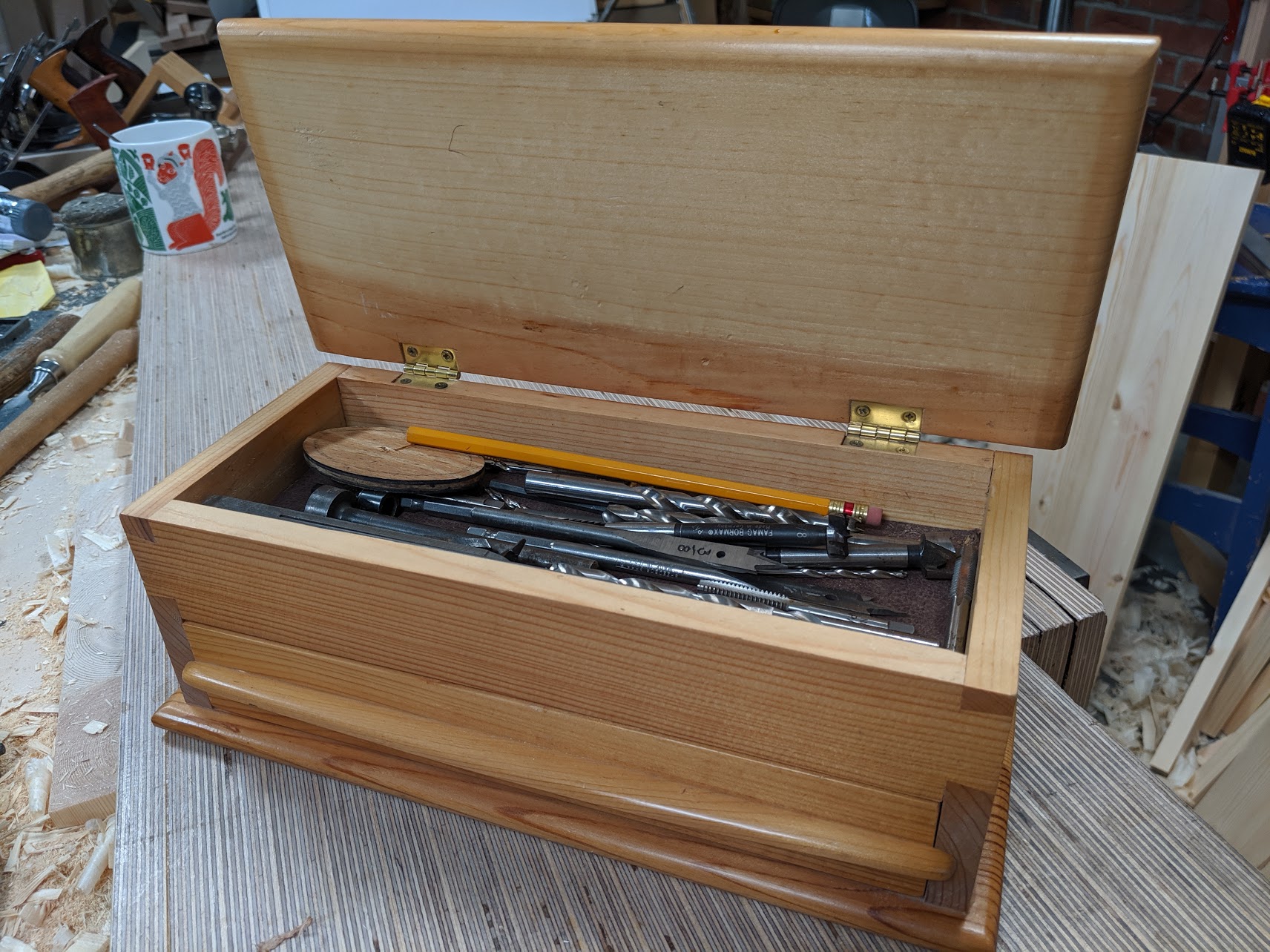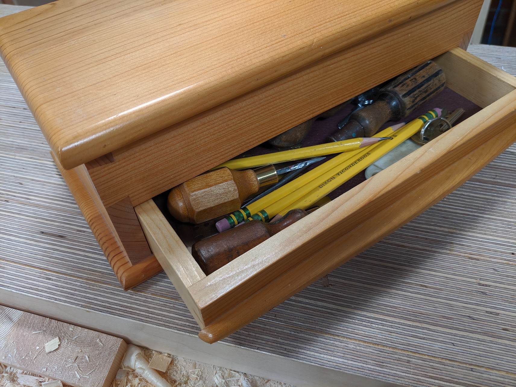 Here's a project I made years ago when I lived in TexasHill Country, two decades at least, and one I really enjoy having for my small stuff like drill bits, pencils and pens, special-to-me screwdrivers and hand tools and and so on. If you have made my Shaker dovetailed candle box, as have thousands of others who have been on my courses with me, then you will see that this is an alternative, more advanced composition with a dovetailed drawer. I designed it to teach drawer making but the small proportions make it just a little more tricky.