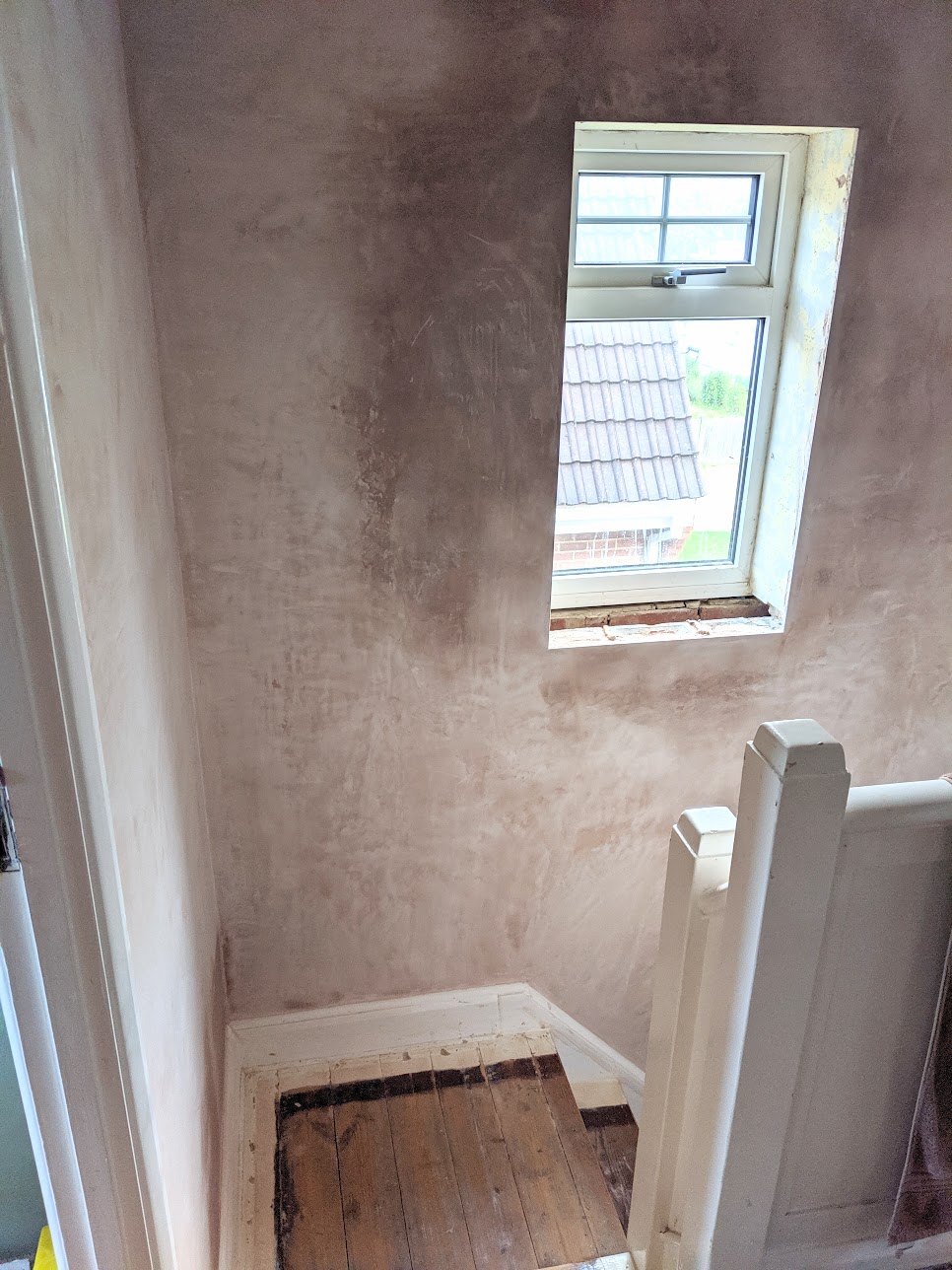 The front living room is now gutted and skim-plastered over. I hadn't expected that but removing picture rails and fireplaces leaves holes to be patched and then surface cracks in the existing plaster means filler and such; it was more efficient and more work effective in getting the pristine, clean and fresh beginning we wanted ready to start receiving beautiful designs in wood that will be our new furniture. Anyway, the walls are now white primed and so too the ceiling so everything is appearing as one at last.