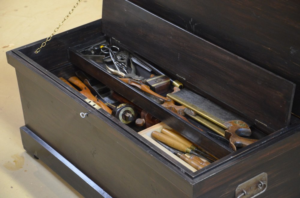 the day George left was the day I finished my joiner's tool box. It was painted black according to tradition and another joiner who also earned extra as a sign painter wrote my name in white calligraphy in the top right hand corner on the front panel frame. I had been making it whenever I could in the back of the timber racks installed in a large shed where no one knew I was doing it. Proud as punch I wrestled it out of the stacks and racks and walked with it on my shoulders to George's bench. His smile was so lovely and indeed loving. I placed it proudly in front of him knowing that without his reassurances through those past and recent years I might not have made it. I first glanced at it from a distance as if eying up a painting. His nod gave his approval though there wasn't really much to see of what was beneath the paint. But I knew the dovetails would have passed muster as I had taken my time with them. Inside there were two tills that would hold the small and longer tools, chisels, gauges and such. These showed the dovetails and I was pretty proud when he said, "These are very nice Paul, well done!"