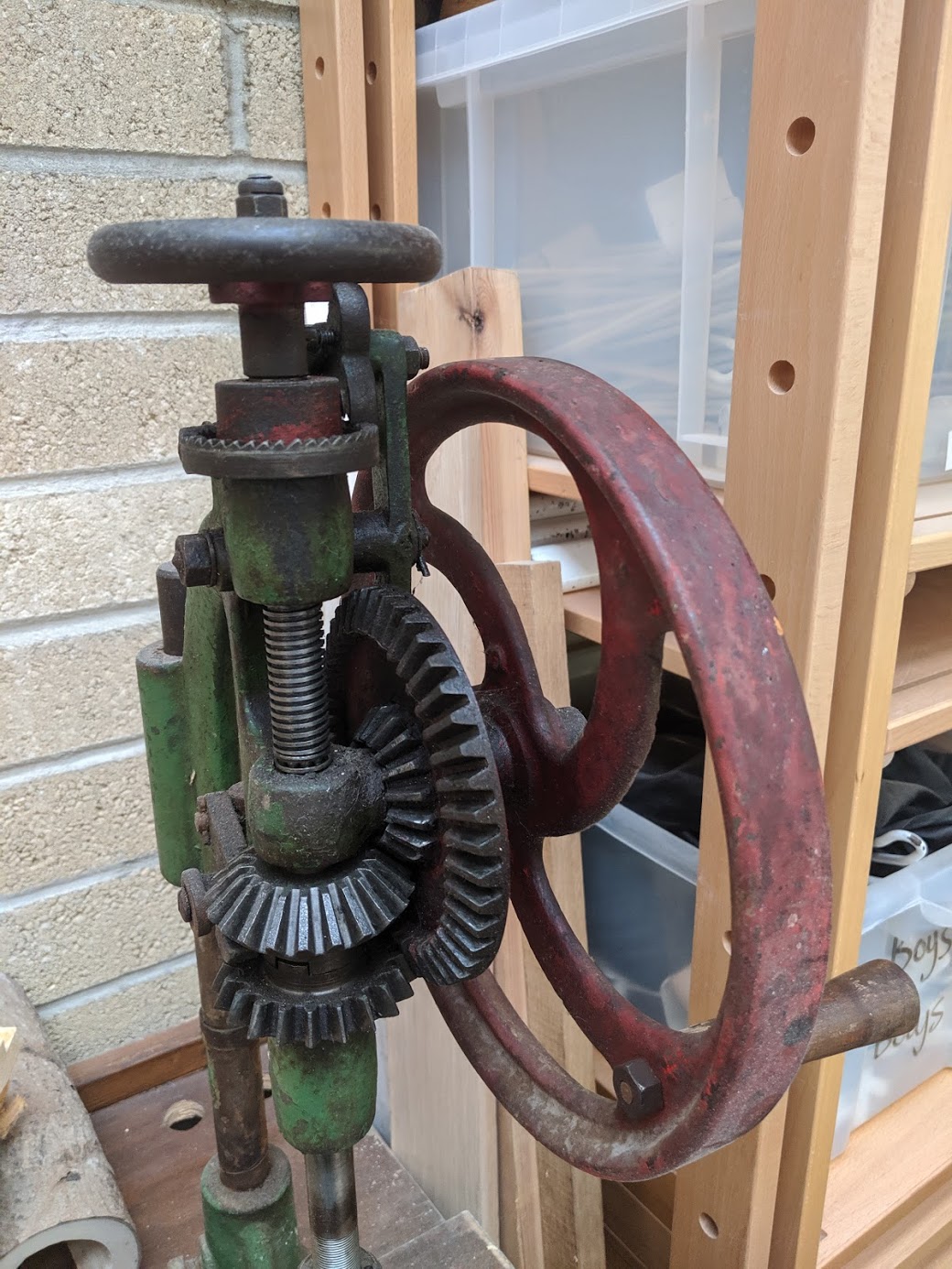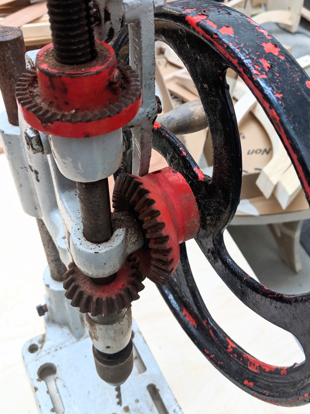 Diving south to Southampton down the motorway for an hour and a half I couldn't help but wonder if this model would be missing an irreplaceable part, as had a couple in the past, or whether it had had some additional element cobbled in to make it look more authentic. I am also a little leery of terms on eBay saying "fully restored" too. A fresh lick of paint, no matter how pretty, can mean something is covered up. I am very distrusting of "See pictures for description as no returns." That's a lazy-man way of saying 'bought as is' and 'no refunds or returns'. This pillar drill is nice. The seller was straight up and because I changed my time of arrival to earlier and he couldn't be there he left it on the front porch for me to pick up. I now have four of these, two smaller versions and then one geared, that can double the RPM and then the torque too. Whereas it is nowhere near as fast as a more up-to-date electric version, it's what I want for testing out and will likely deliver the answer I'm looking for.