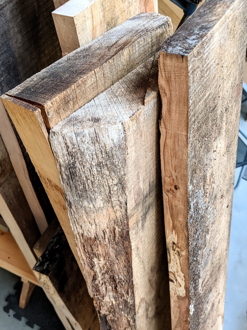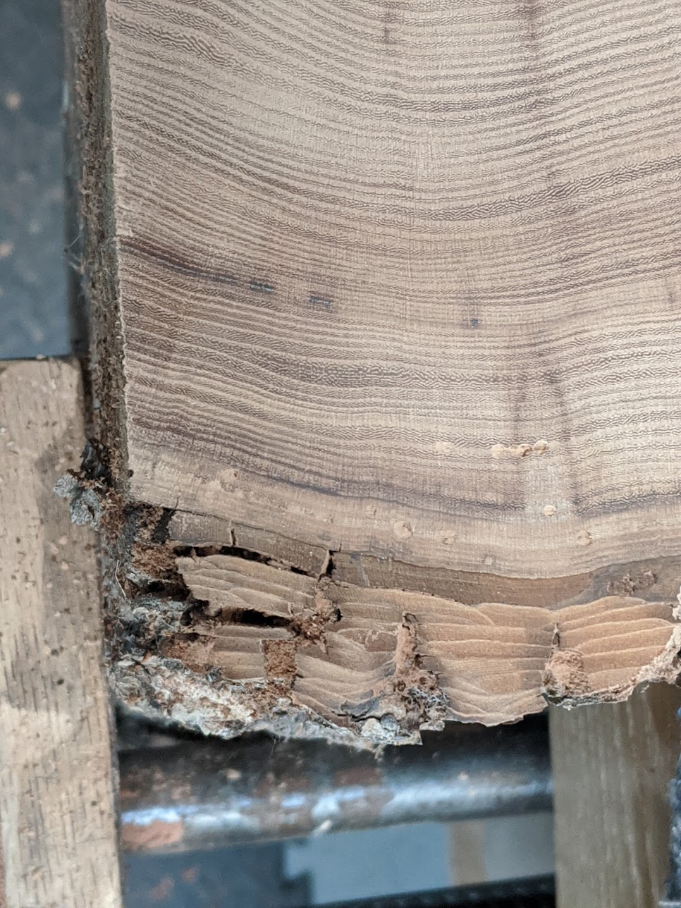 Mostly that means that beetles will have laid their eggs in the bark and the grub will find its food in the sapwood just under the cambium. In such cases the grubs bore up and down the narrow band to find the nutrition it needs to survive. Often they will take a detour into heartwood but not too deeply. Two tasks are ahead of me now to ensure minimal damage takes place straight off. Firstly I must decide if wane stays or goes. This can depend on a couple of things - one, whether the beetle work is character-giving or ugly, two, will I want waney edges on the specific piece. Another factor becomes evident with roughsawn wood that has aged over a few years and that is the bark and sapwood starts to disintegrate and becomes punky. This then absorbs and retains moisture which then discolours the heartwood and can lead to further rotting and decomposition. More decisions!