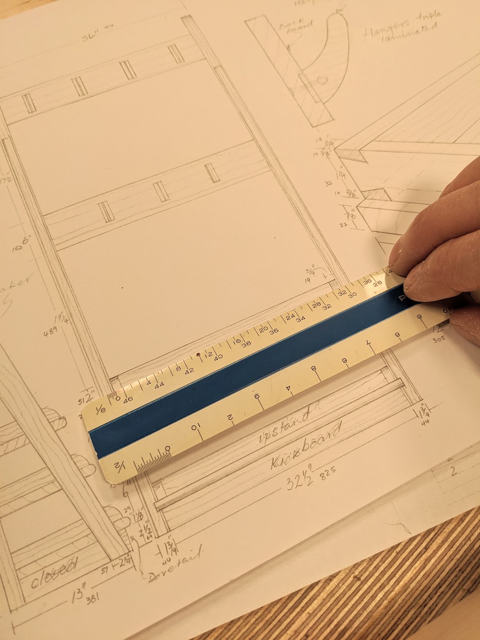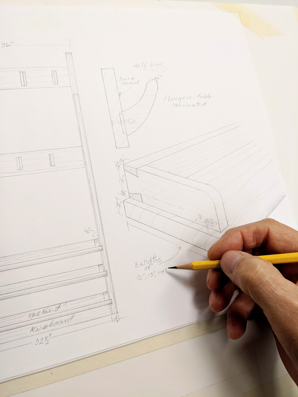 I started with my drawings first and then created my cutting list from this. I'll try to use scraps for any prototype elements where possible and will then laminate parts too to make up sizes I don't have. Sometimes this means using thinner stock for components because of standard sizing from my supplier. Whereas I might like 7/8" material in the final piece, I may well only have 3/4" pine or even plywood to work with in the prototype's first iteration. When I am part way through I may well change this or that to change something I don't care for or take care of a weakness I didn't foresee.