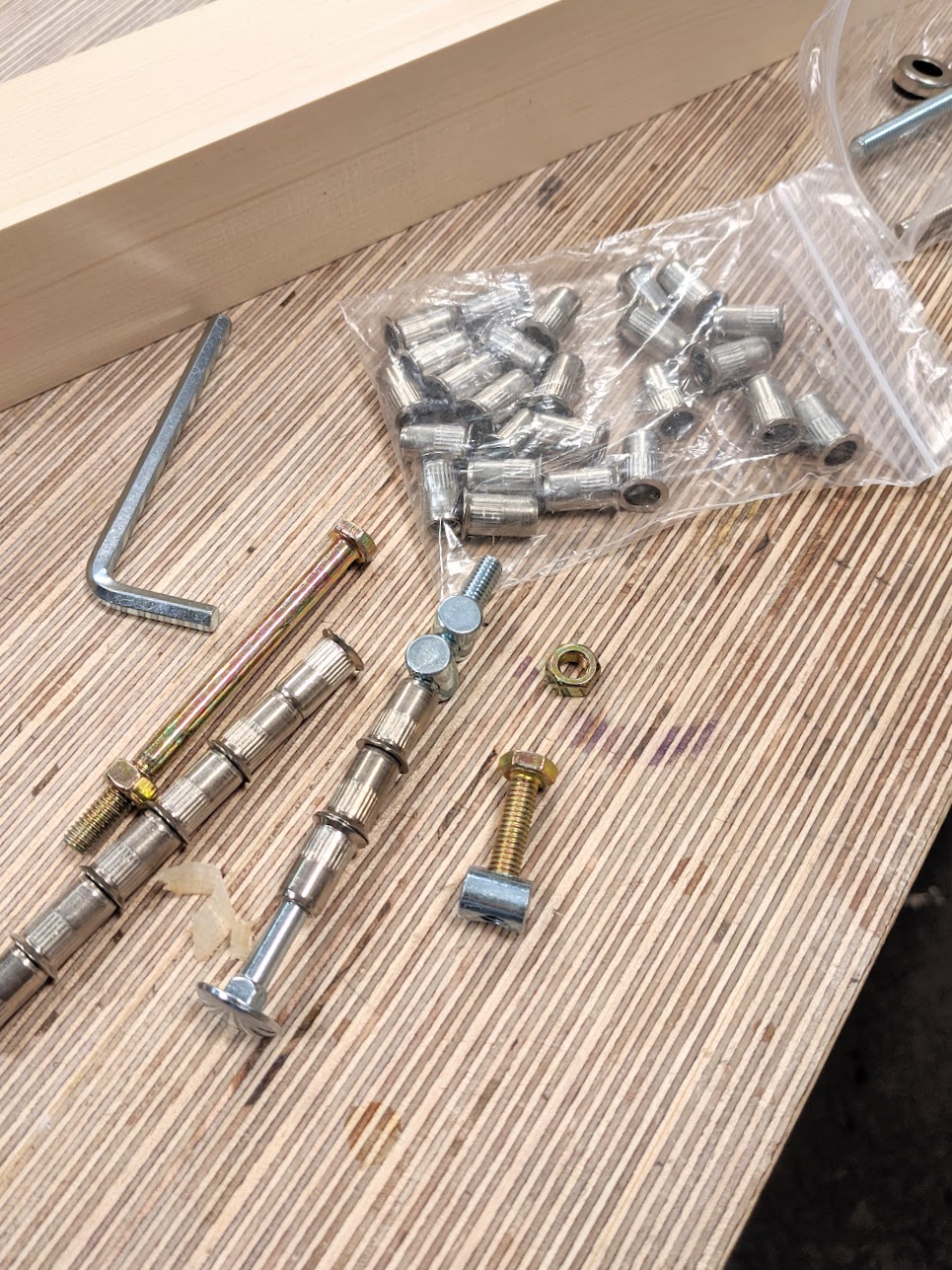 Unfortunately it's usually not the fastenings that make the units sold environmentally unfriendly and cheap looking but the materials the units are often, not always, mostly, made from. MDF and particle board are both the very lowest quality material option yet for the poorer it is often their only option. Fastenings are ideal for dismantling larger framed projects and that is what I wanted for this one. Two triangular side frames are mortise and tenoned together in part and they provide the stanchions for the cross members to fit into that give permanent rigidity. All of the cross members combine joints with added bolt fastenings to allow for the next needed break-down.