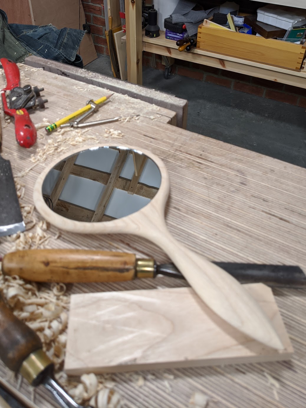 It was a special moment, an offcut of ash 6" wide, 1/2" thick and before I knew it I had the mirror recessed to perfect depth and the shape came so naturally from a flat-bottomed spokeshave, a little rasp work and then some scraping with a card scraper followed by light sanding. It's another prototype. You should watch me make table tennis bats. We used to make and use them when I was an apprentice.