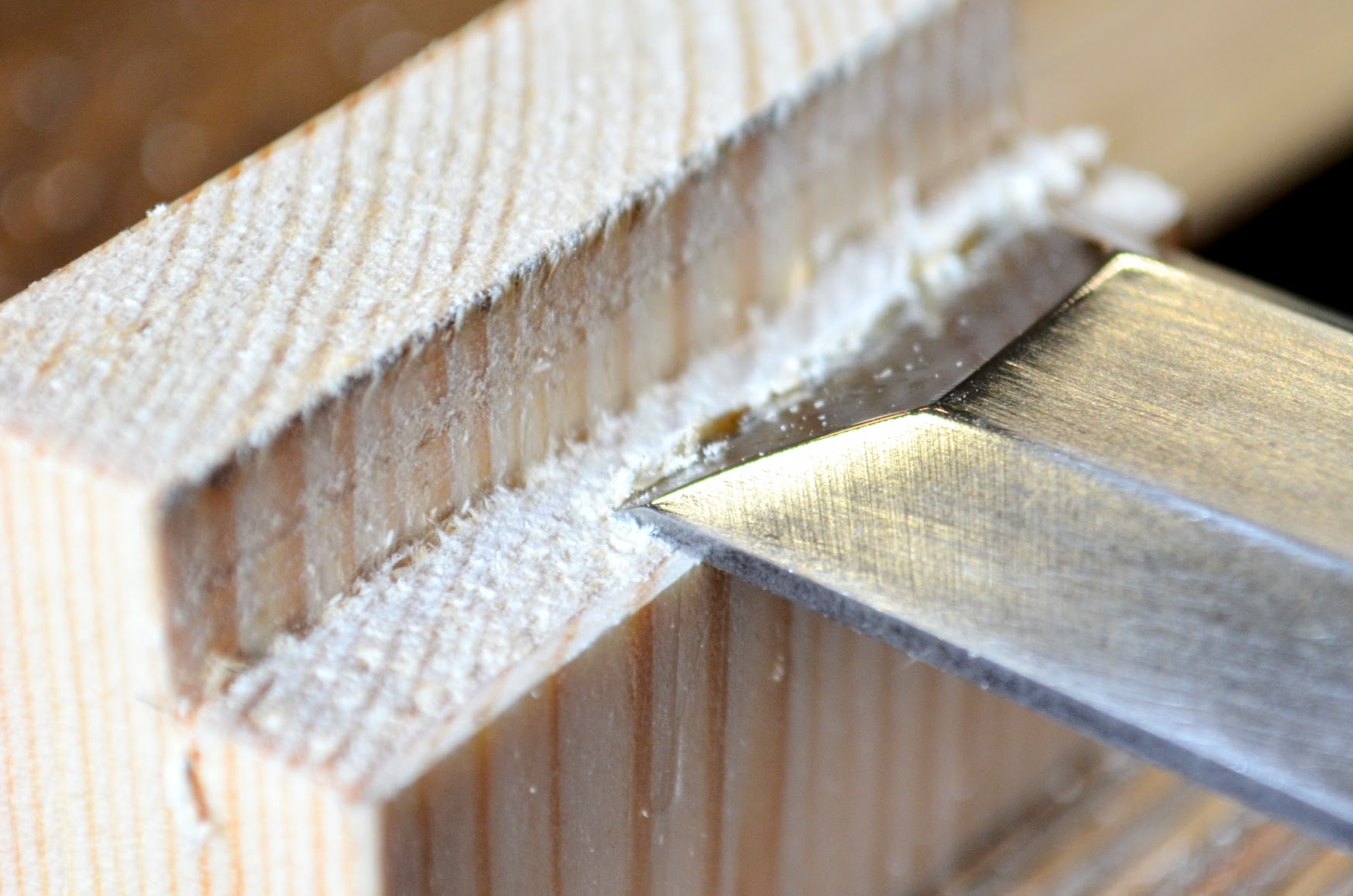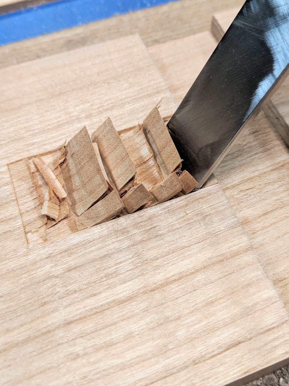 Now on chisels. Whereas I might admit that a dead-flat face is of some value, that is rarely essentially the case in terms of using them and actually it is as I said earlier, rarely possible for anyone with the kind of equipment we have access to use to get a meeting face to a bevel truly dead flat. That being so, we should rethink why we actually need the chisel to be so dead flat. Let's say that 50% of chisel work is chopping and the other half is paring. In both cases, dead flatness is not really needed. Experience through the years tells me that we constantly micro-adjust the presentation of the chisel to the task by what we feel and see as we use it.
