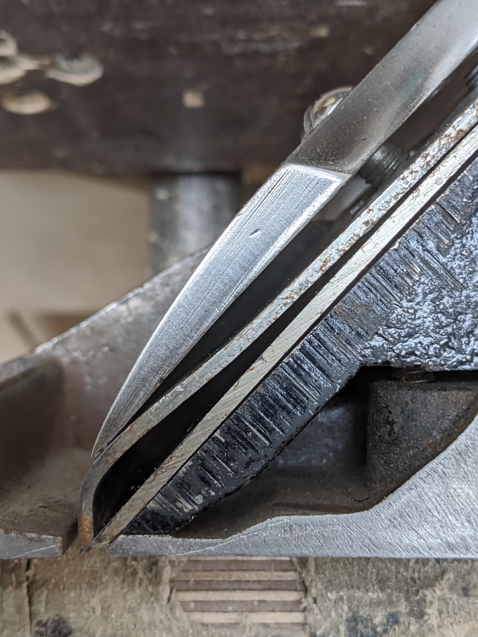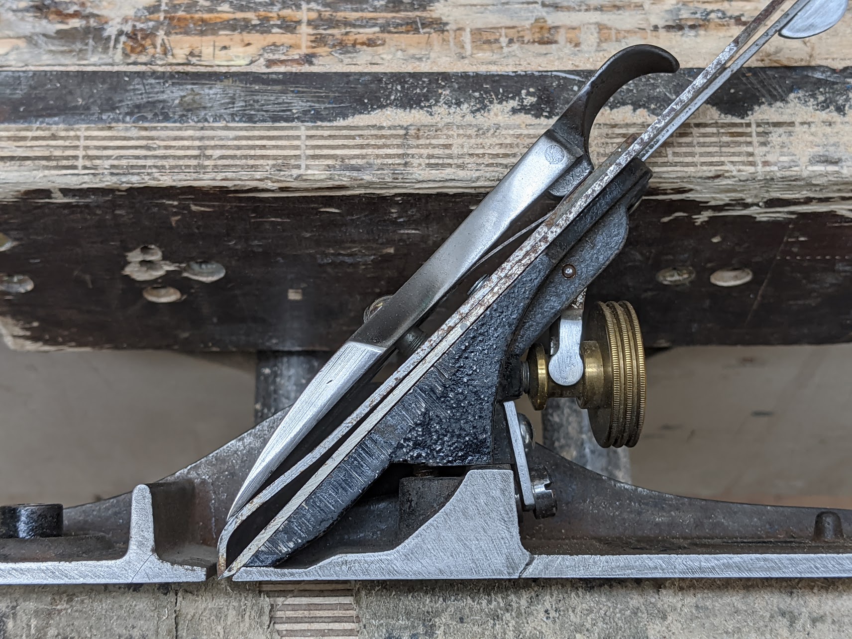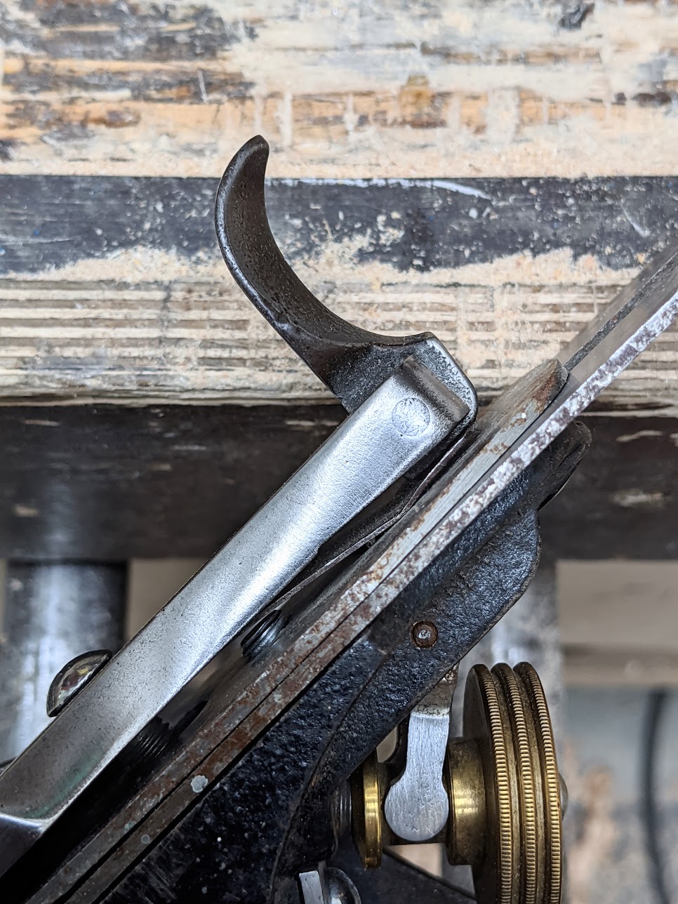 The relationship between the cap iron and the cutting iron is critical to bevel down planes with thin irons, even if the thin irons have indeed been replaced with so-called thicker irons. Cutting the side off a plane helped me to see the reality the power of the lever on the lever cap had at this critical juncture in the plane iron assembly beneath it. The lever at the top of the lever cap is powerful. Pressing the lever from open to close is a transfer issue whereby the foredge at the lowest point or edge of the lever cap applies force along the hump of the cap iron that in turn applies pressure along the whole of the flat face of the cutting iron to press it wholly to the leading edge of the rear part of the plane's sole a d then too the lower area of the bed of the frog right up as close as possible to the cutting edge of the iron.