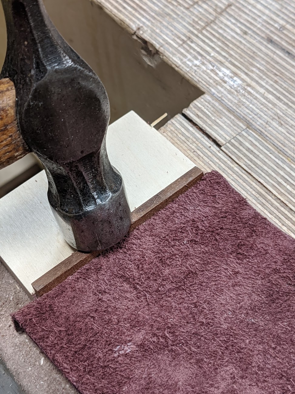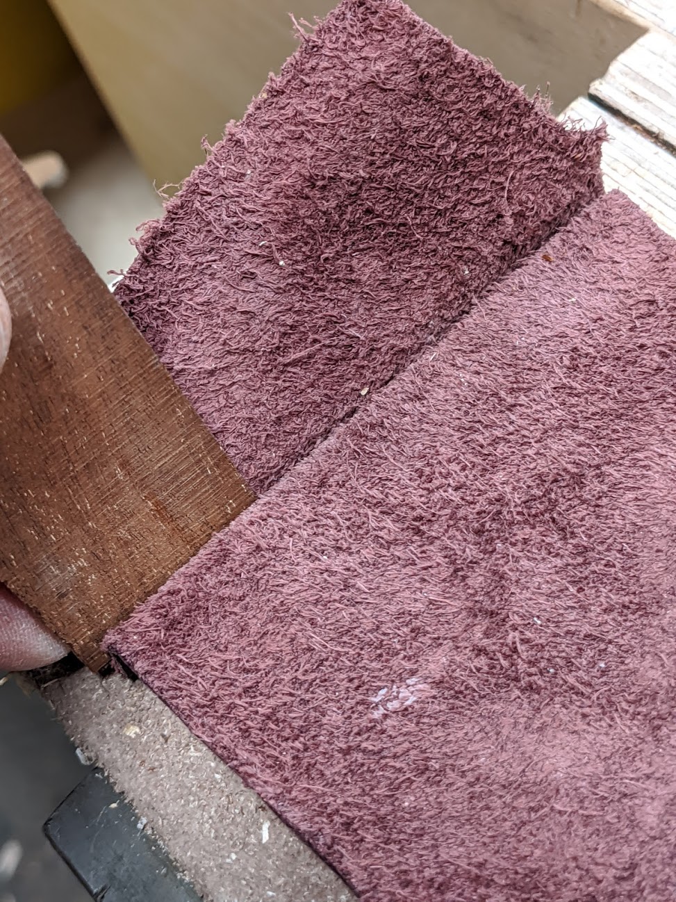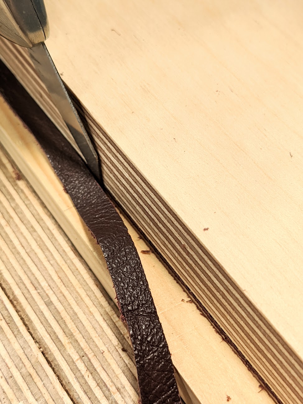 Flip the strop over onto a scrap of wood and trim the leather to width.