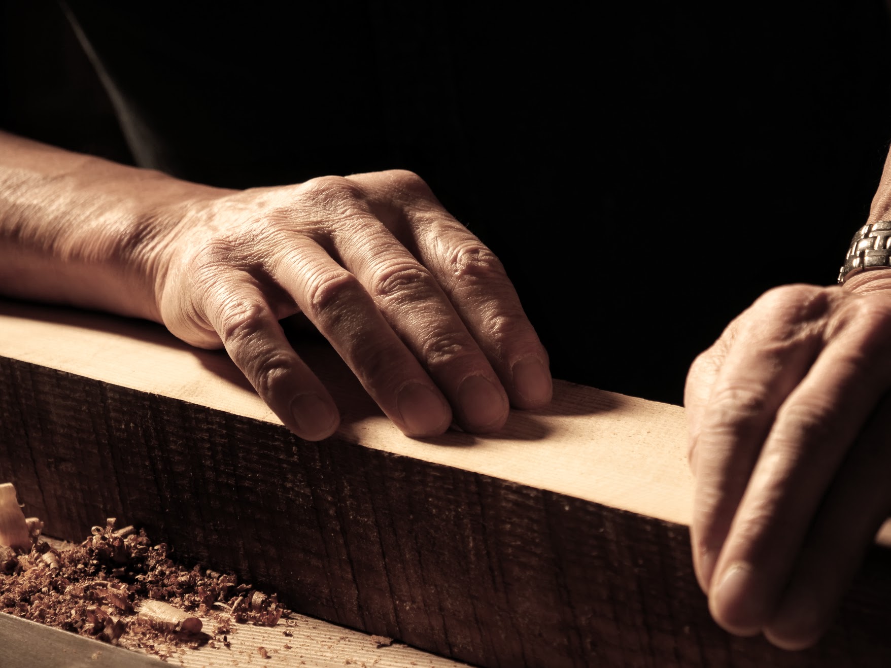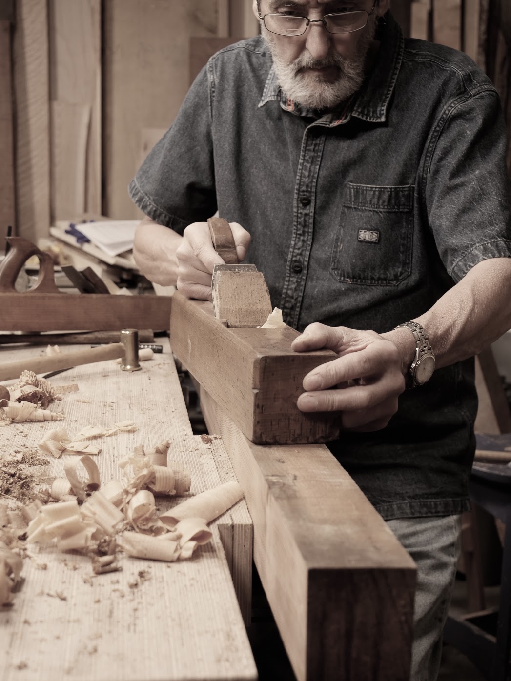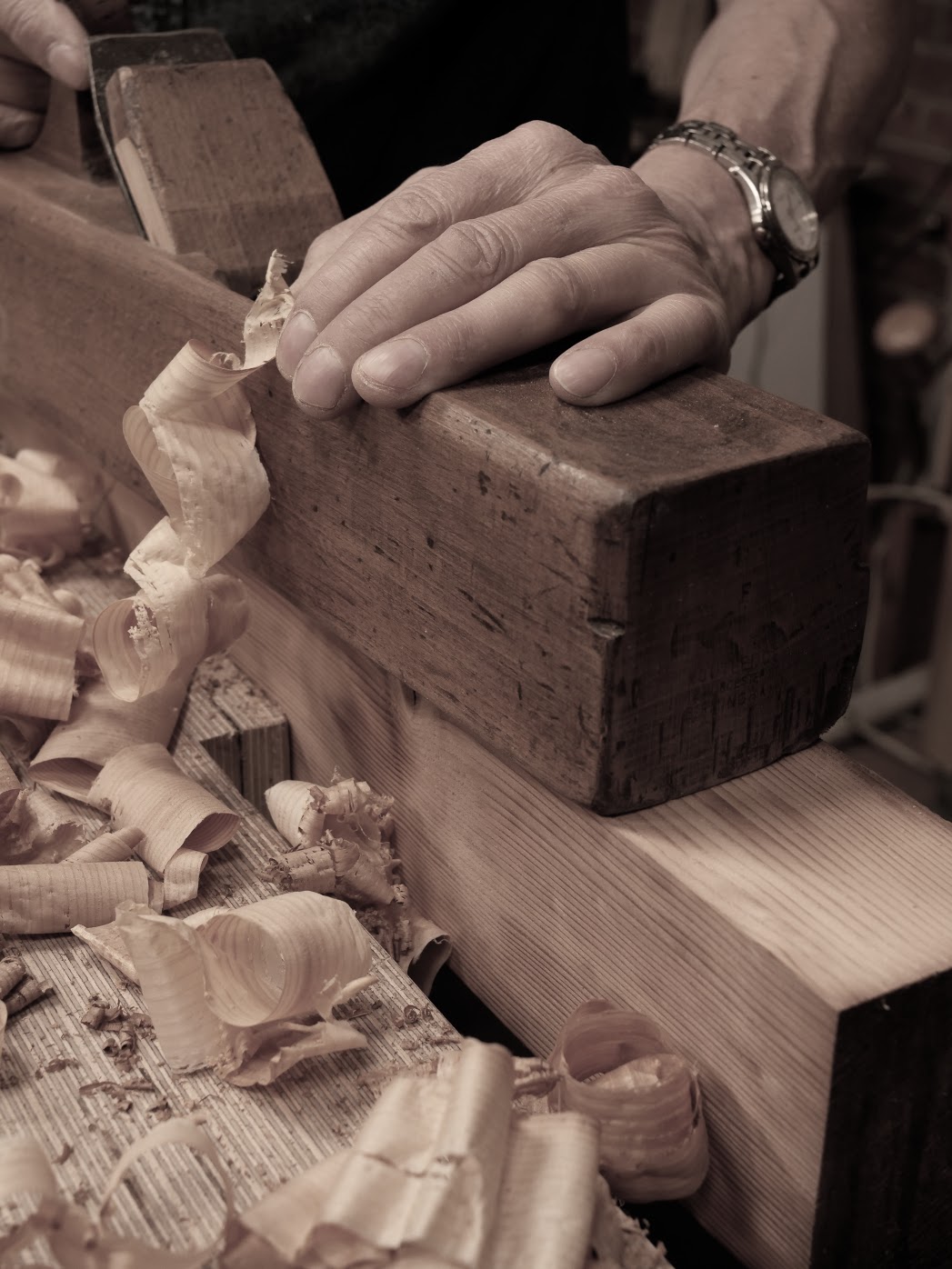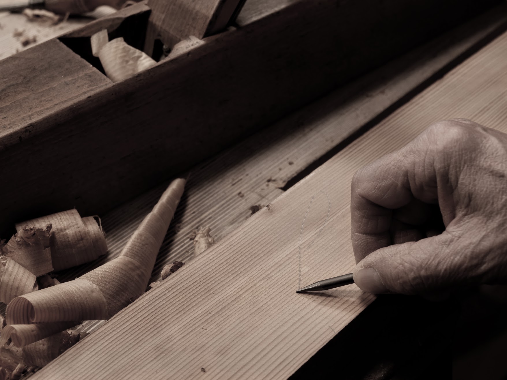 The man flips the board, measure its length in a short gaze and takes the crayon to mark its proven face. The vise grips, an iron jaw takes hold and the man raises his plane to determine its course on the wood once more.