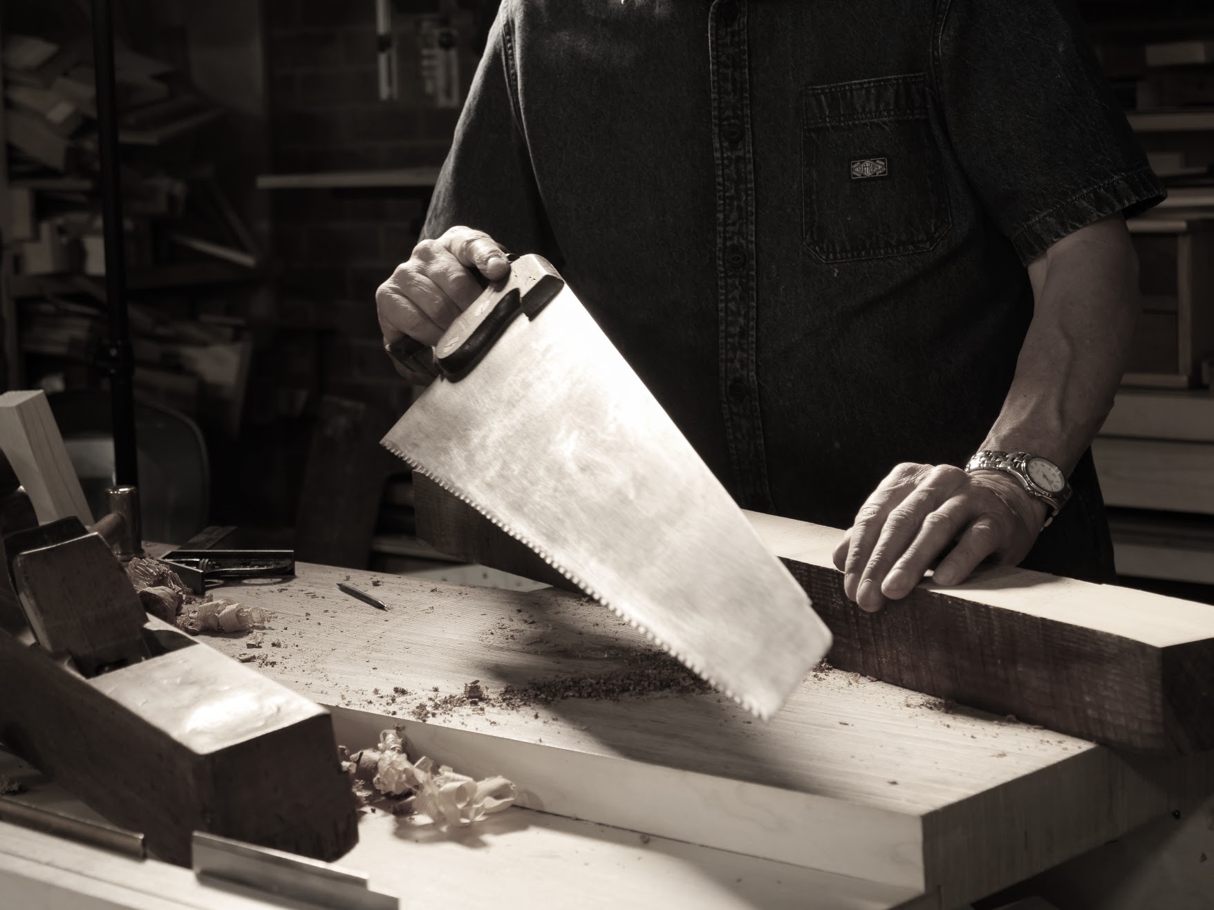 The wait continues for moments, and once again the gathering of the breath, the steadying of the firm, strong pulse beat restores a rhythmic peace. So it is for the man who works his wood by hand in a search for harmony through the cutting edges of his tools and the shaving off of all excess before the joints are made.
