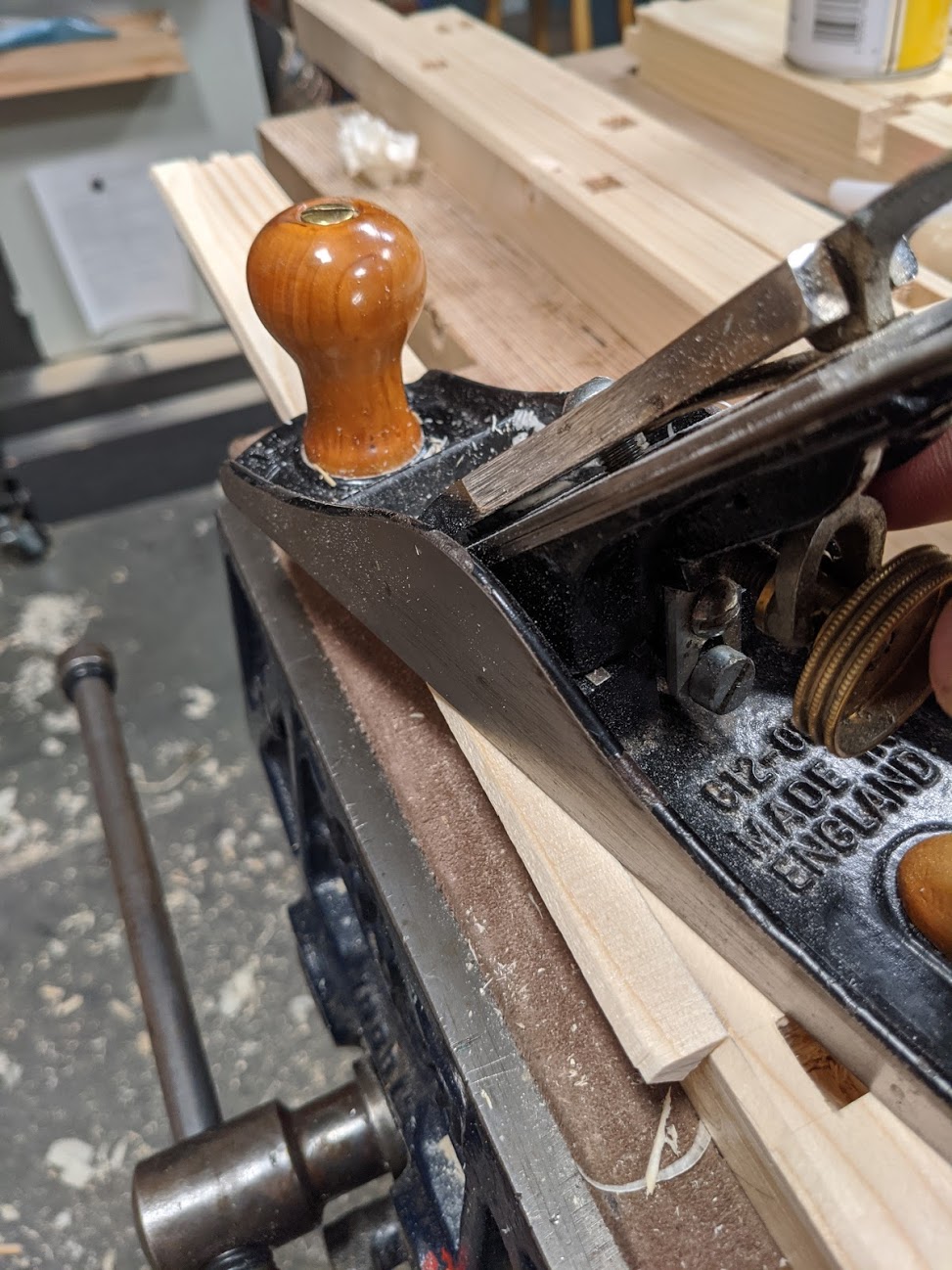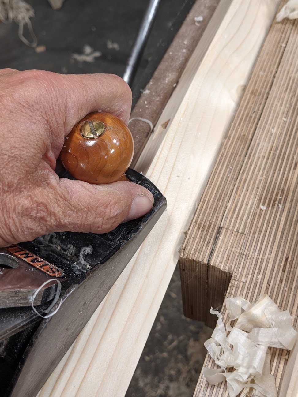 I took my plane as I have done many times since that first time with George and planed off the corner at 45-degree in a long tapered bevel.