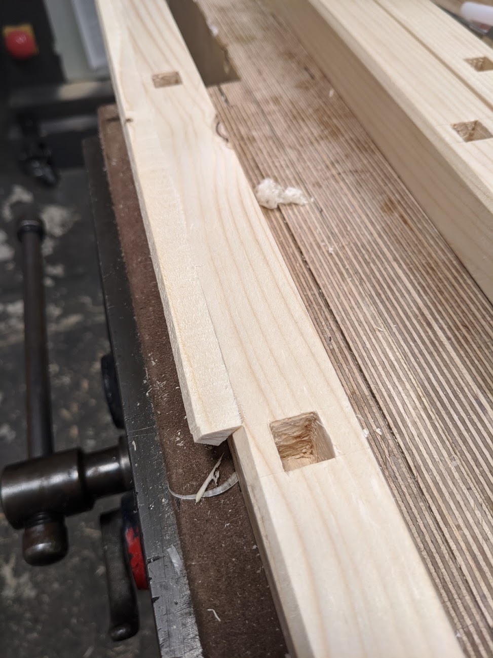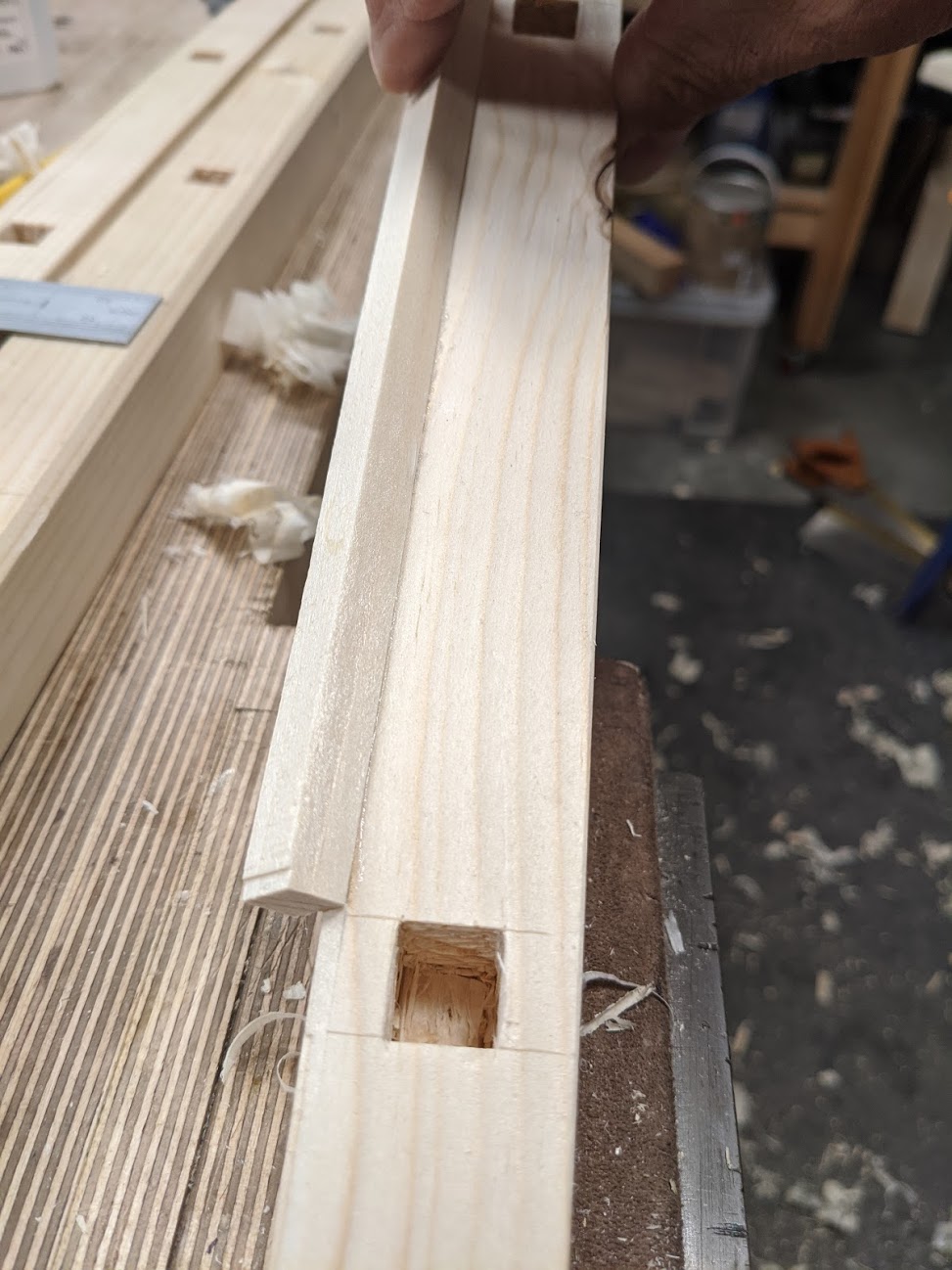 Working on my shoji panel a corner off of the bevel had literally just popped out after I had completed the three twin tenoned joints to the stile. It happens.