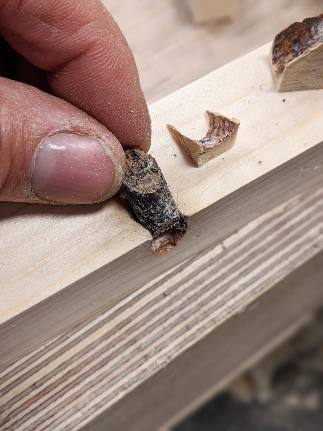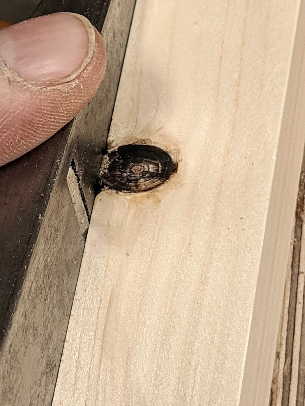 It is not hard to find another knot of similar size or indeed reduce a larger one to a smaller diameter. In this case, purely by chance, I picked a piece of wood with a knot that fit the existing knothole.
