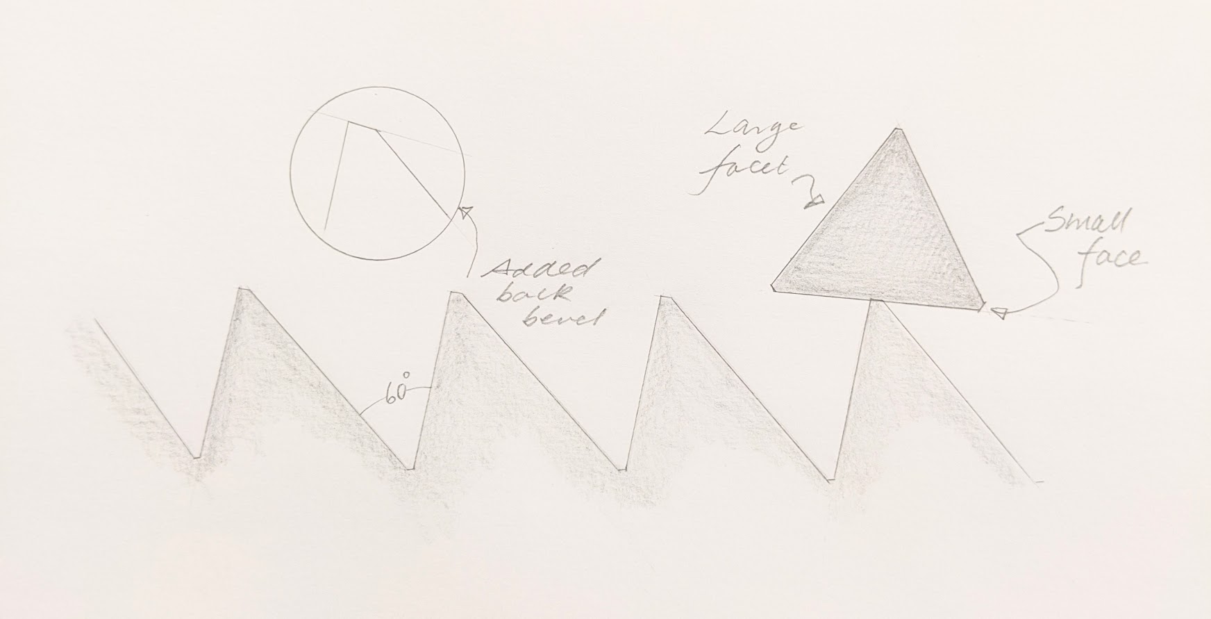 Having never seen or heard of this being done before I felt something of an adventurer -- a sort of defying tradition on the one hand and then on the other, totally accepting of them and my standing on the shoulders of giants who went before me. What happens is simple enough. I sharpened the gullets of the rip with a single pass through the gullet at a measured length and hand weight. This regulated the depth of cut to the steel and ensured the teeth stay the same height. Once done, I passed the file onto the tip of each of the teeth at an angle as shown in the drawing to create the back bevel I wanted. You must take care not to take it down too much as you rely on the edge to guide your filing. This too was a mere single pass stroke of very light hand weight. As if you are somehow just stroking the tooth. There is no force used and if anything I am suspending the file across the tip to take off the barest amount. Even so, this results in a flat plain about .75mm wide. This is enough not to do again for about five standard sharpenings. On very fine-toothed saws, this is a little less easy because of the size and the width of the saw file. I'd say it's not worth eye-strain or the effort doing it to teeth 18 PPI or more. On 16 PPI and less, it is definitely worth the extra pass as it is literally two minutes' work.