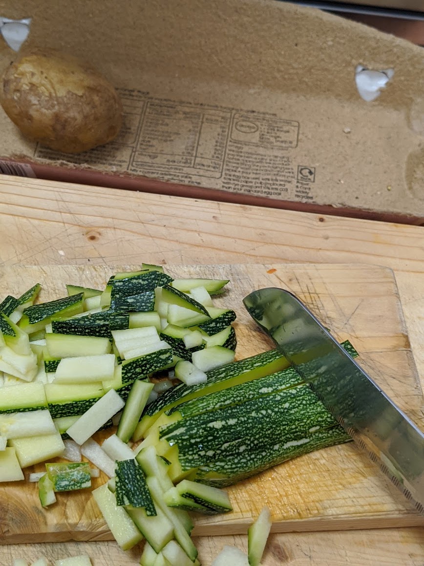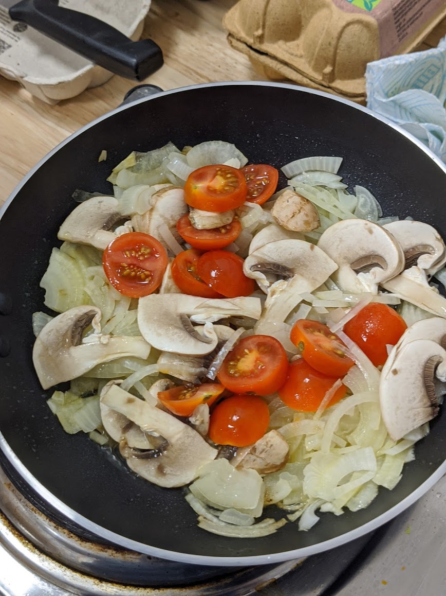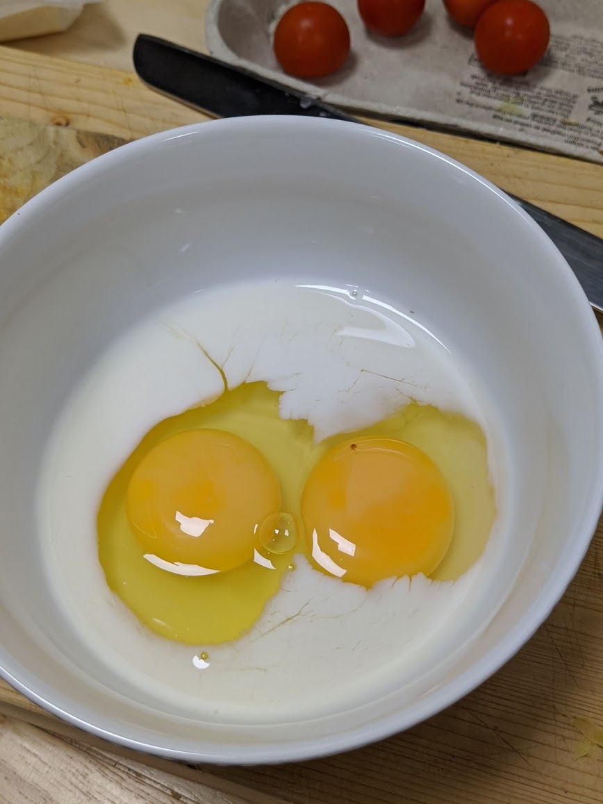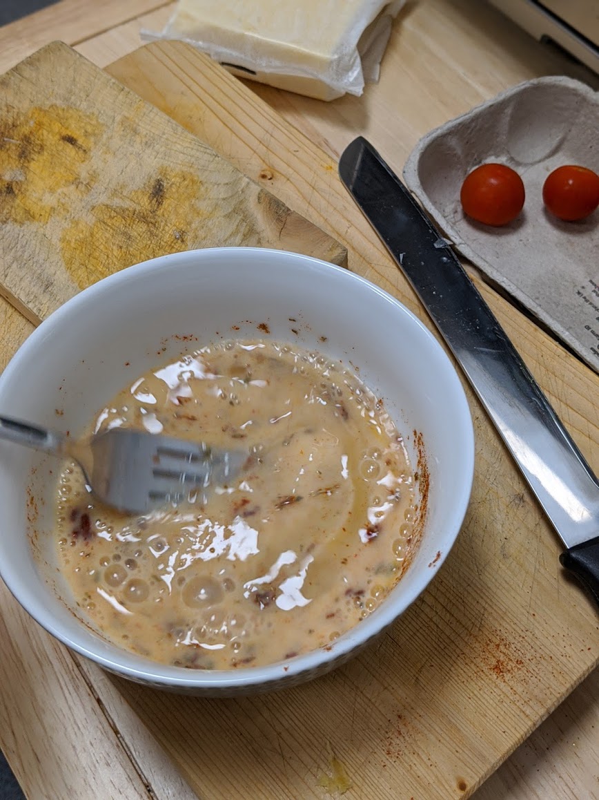 While the above takes place any downtime facilitates putting the ingredients in place for the omelette and making it as follows: