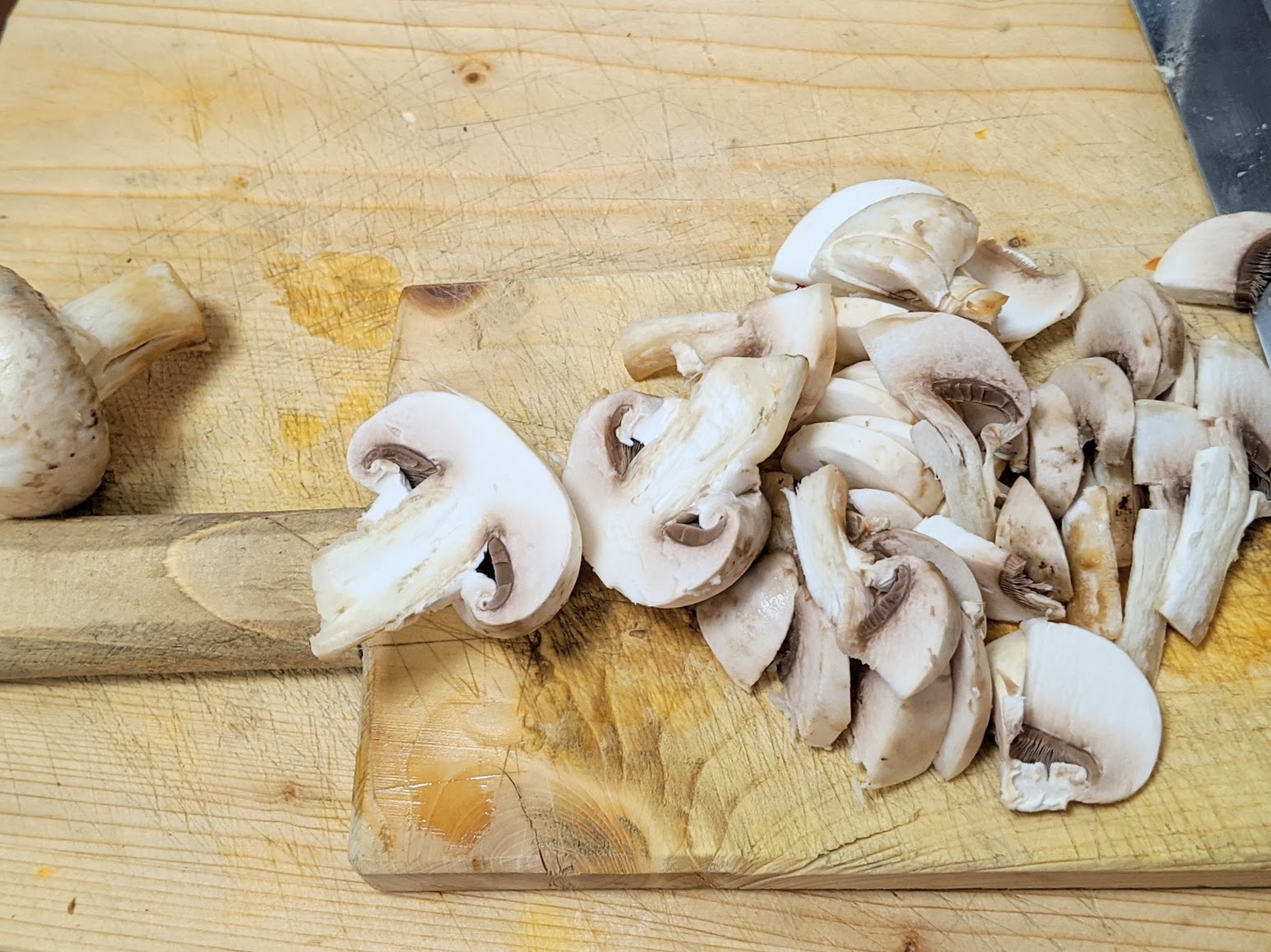Slice the mushrooms along their length by cutting first in two and then placing flat face down and cutting into thin slices 3mm or so thick. The thin slices mean quicker, more even cooking.