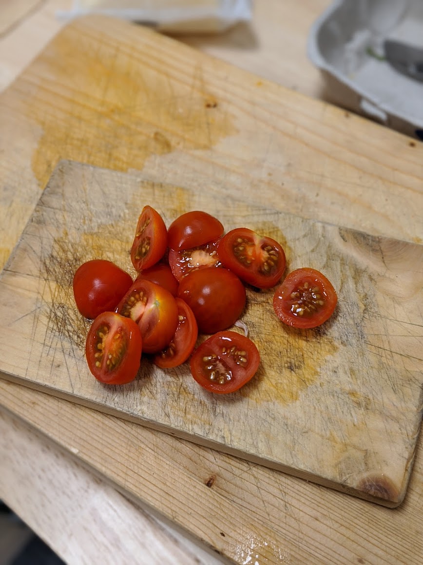 Slice the tomatoes. I generally aim for three cuts on cherry tomatoes. The cook through more evenly that way.