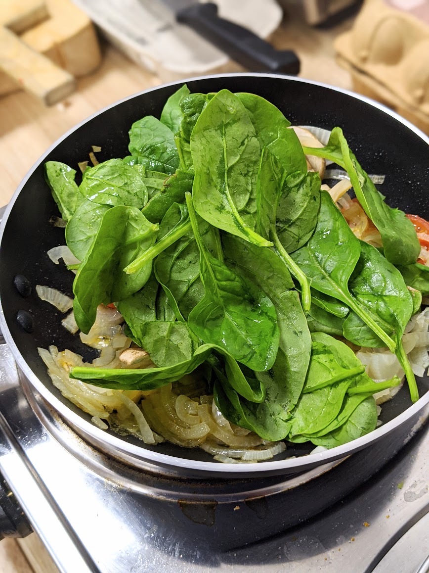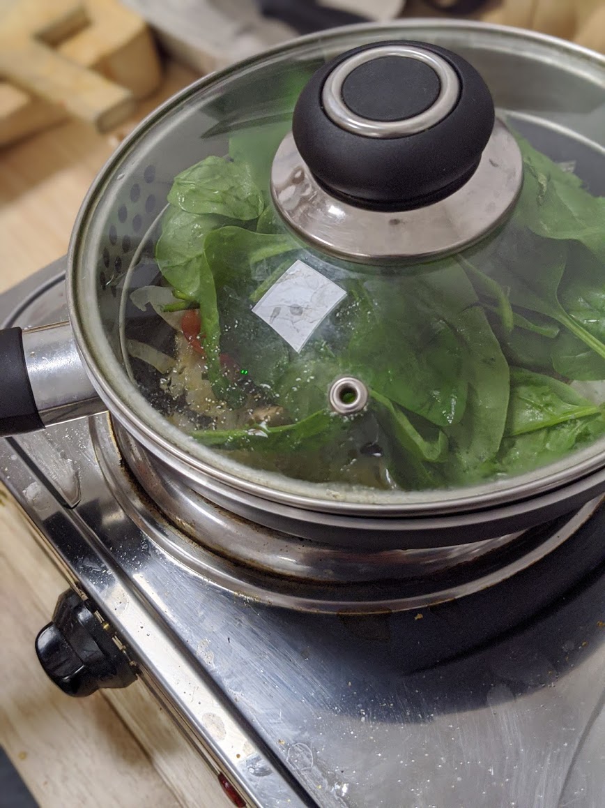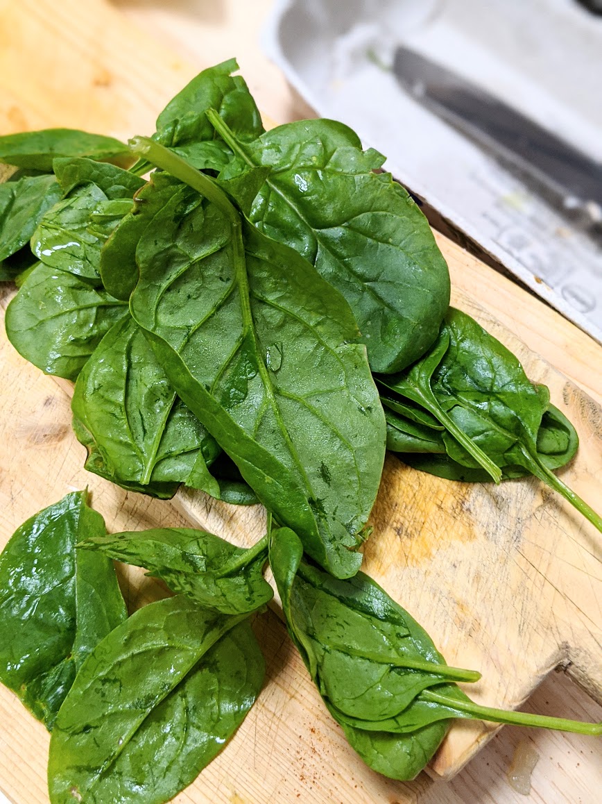 Finally the spinach. Add a handful of spinach over the top of all ingredients and keep on a medium heat for just a few minutes until the leaves flop and turn a darker green.