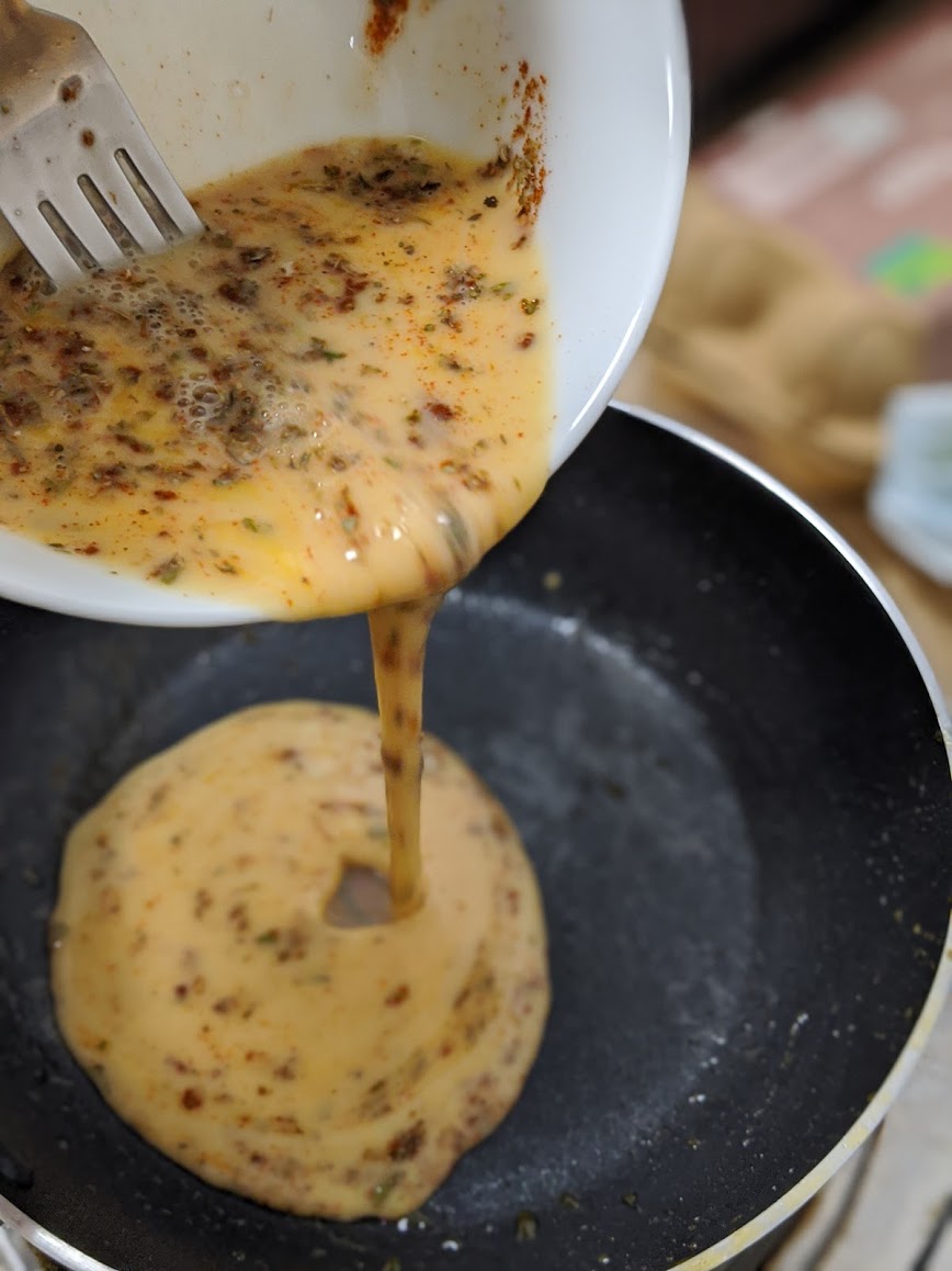 Carefully pour into the pan and heat to a mid-high heat setting. I like my omelette a little brown but not burned. In the final pic bottom it is the seasoning of cayenne that is giving the darker appearance.
