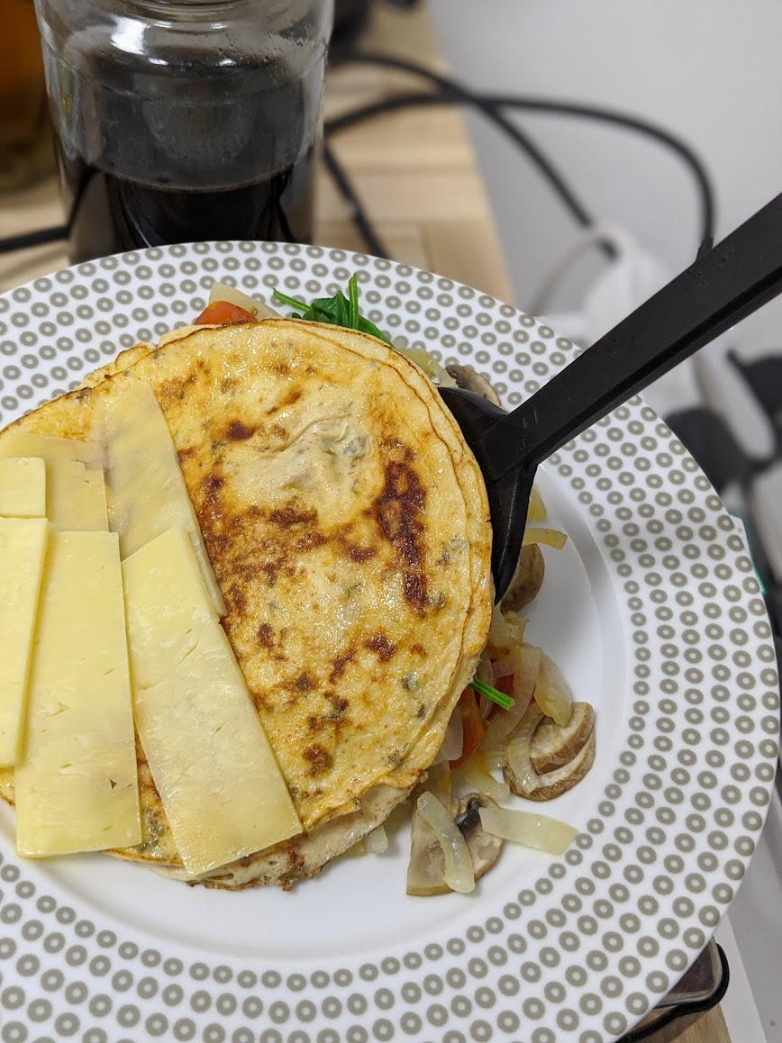 With your veggies cooked and set aside in a warm place to retain heat, you will have prepped your omelette as follows: